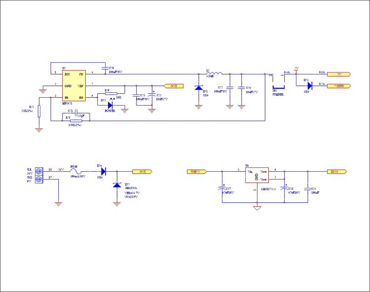 Tantalum capacitor + self-recovery fuse + anti-reverse diode + TVS anti-surge diode