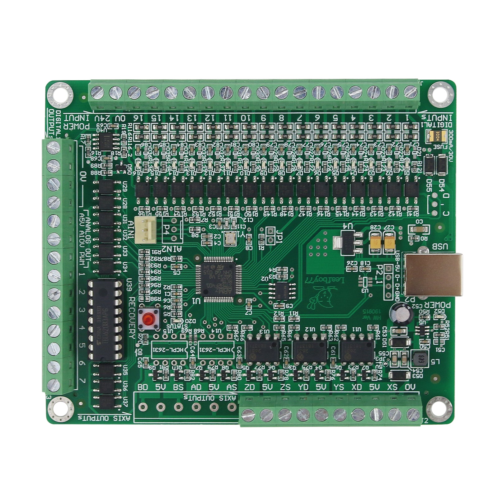 - Using 3 dual-channel 10Mhz high-speed optocouplers, 26 general optocouplers, a total of 29 optocouplers, isolate all input/output. The high-cost design provides complete anti-interference performance and complete safety protection.