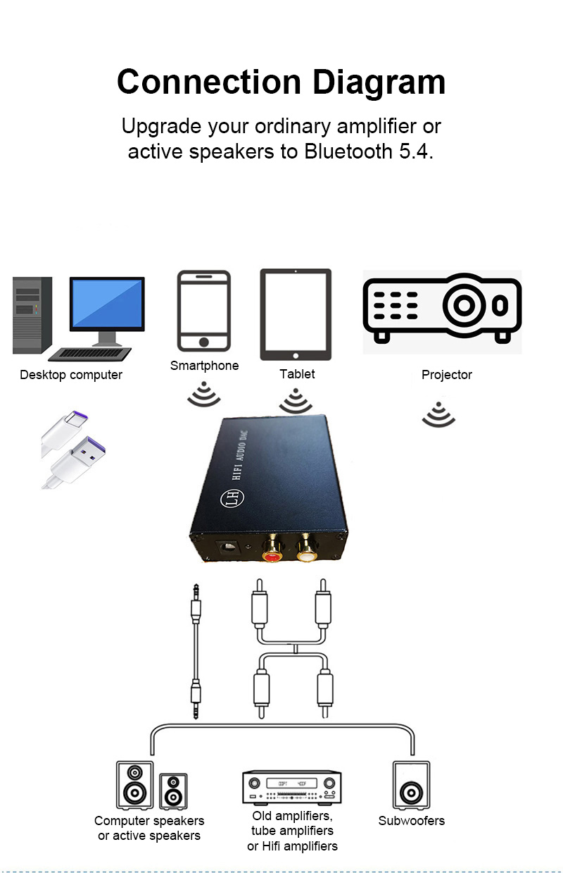 * Type-C Port: It can be used to power the Bluetooth decoder via a Type-C cable, or connect the decoder to a computer as an external USB sound card (supports 16-bit / 48kHz audio on PC).