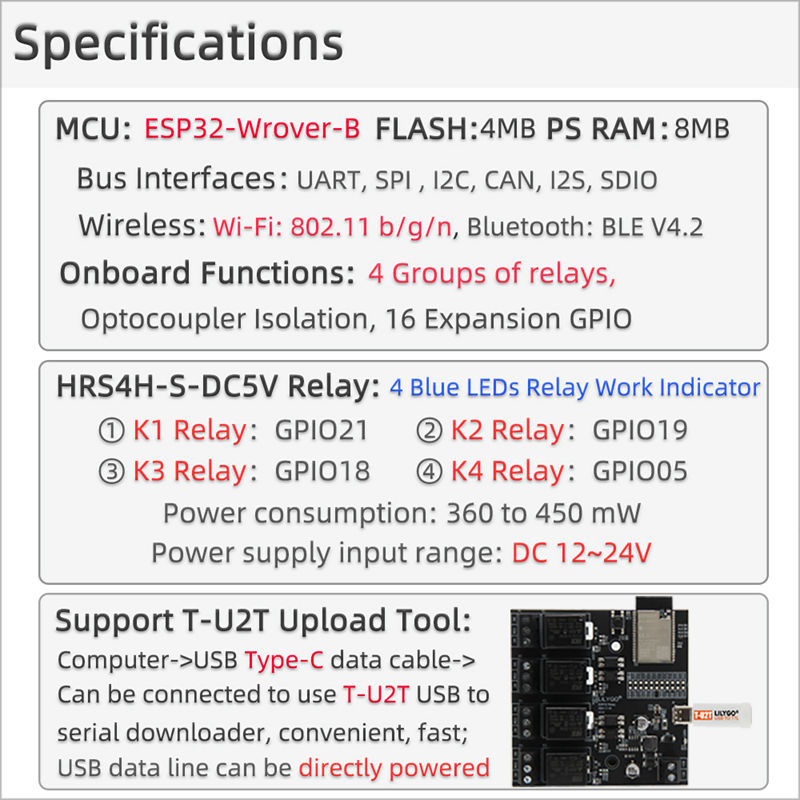 LILYGO T-Relay ESP32 DC 5V Relay 4 Channel Relay Module IoT Relay with T-U2T Automatic Downloader