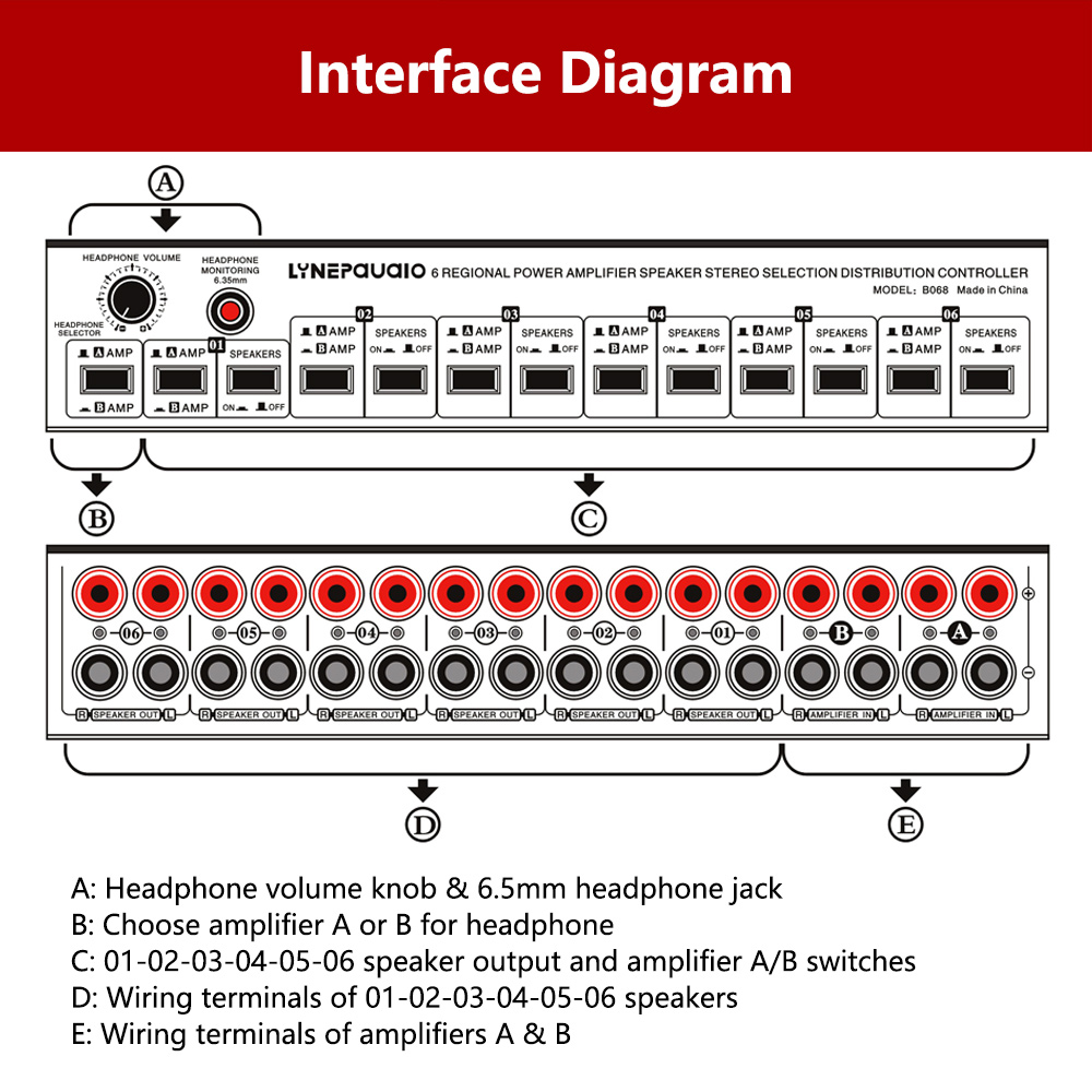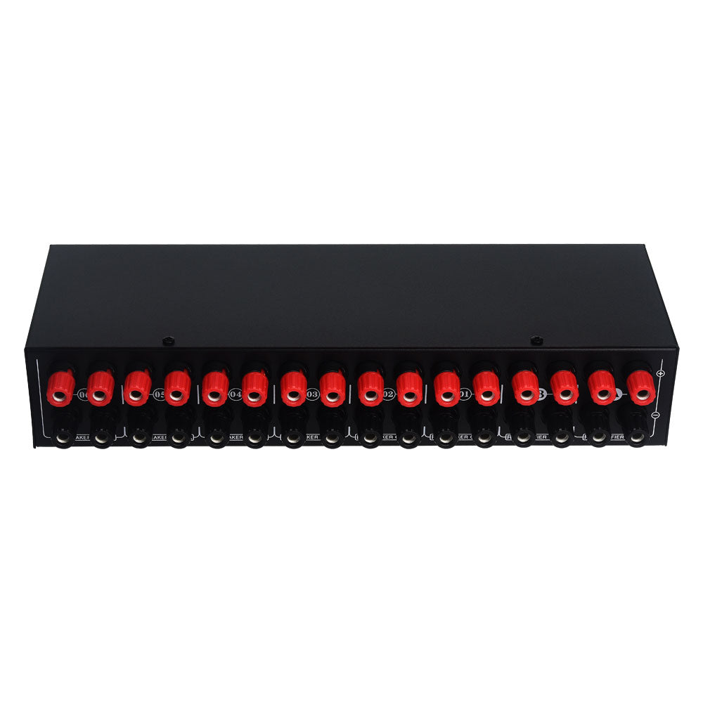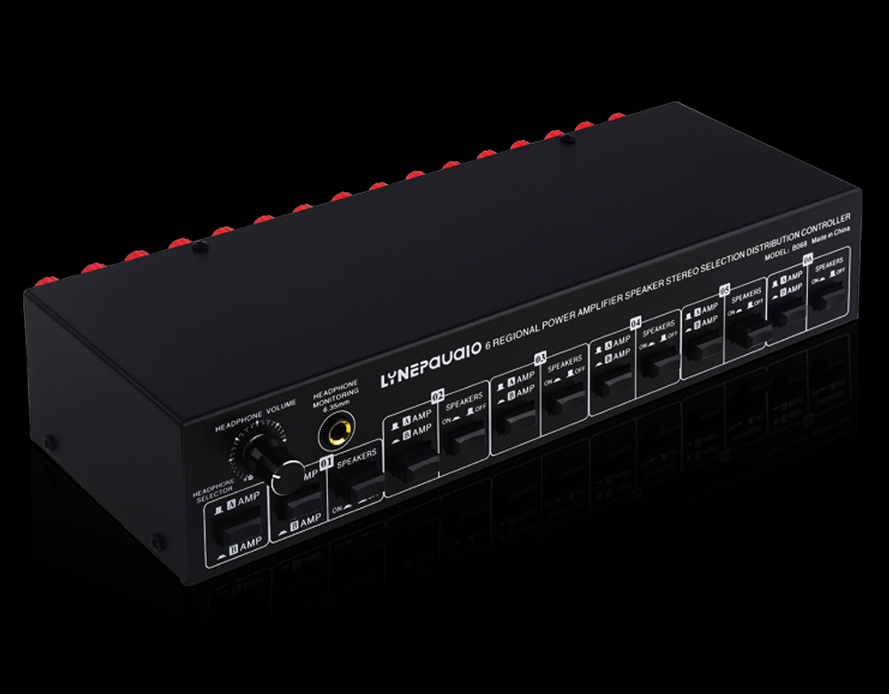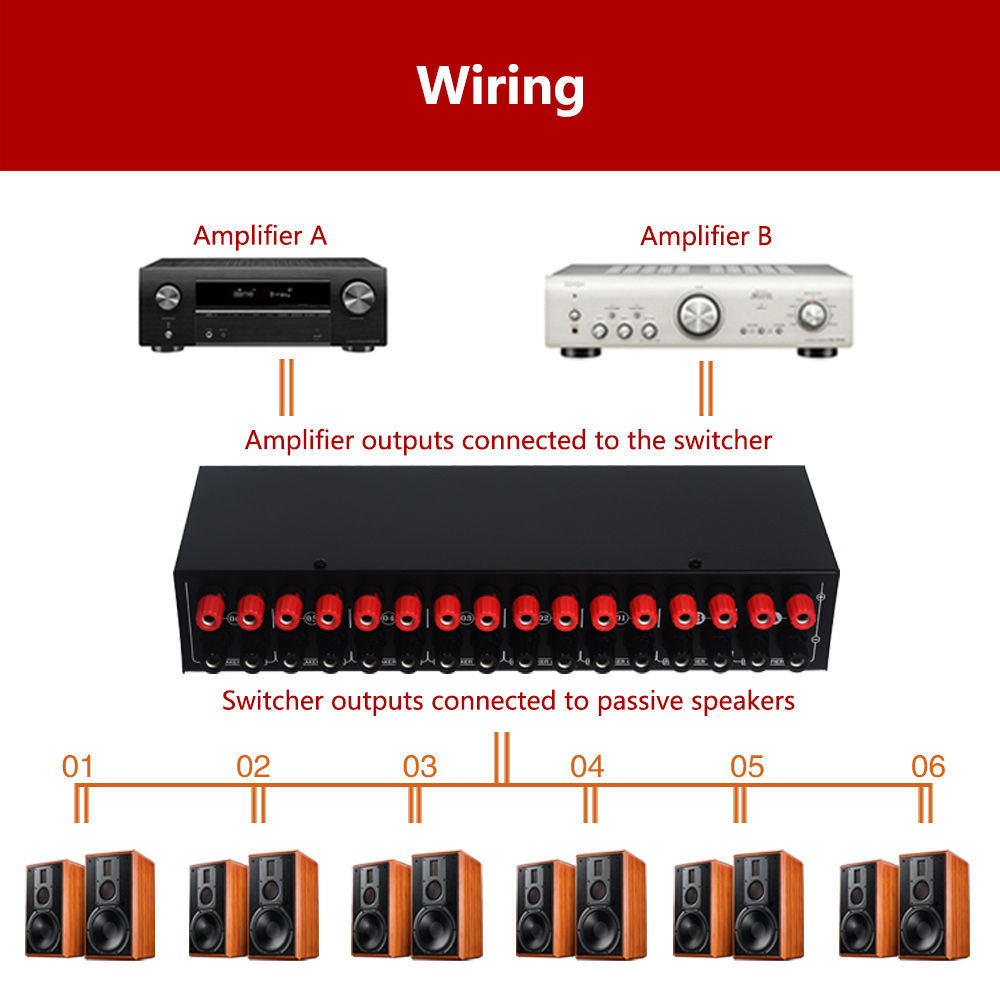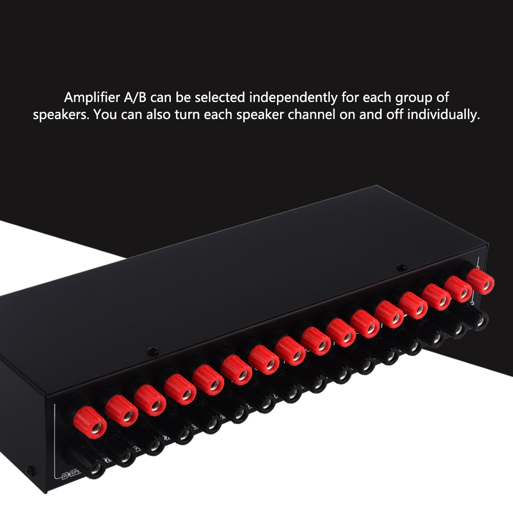 - The amplifier speaker switcher supports 2 stereo amplifiers to input and 6 pairs of stereo speakers to output