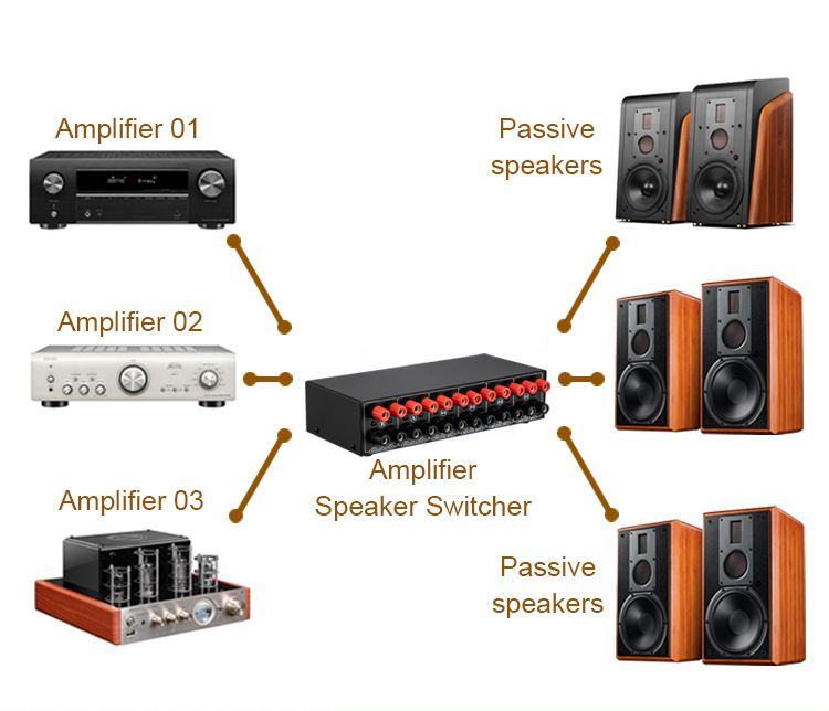 - Amplifier speaker switcher supports three amplifiers to input. Pick one out of three. Simultaneous input is not supported.