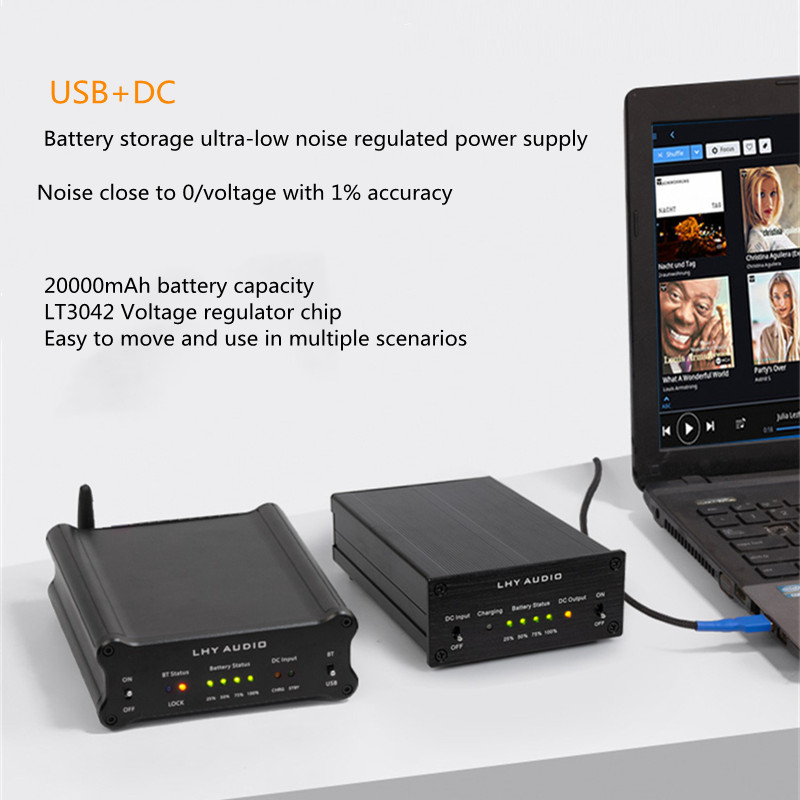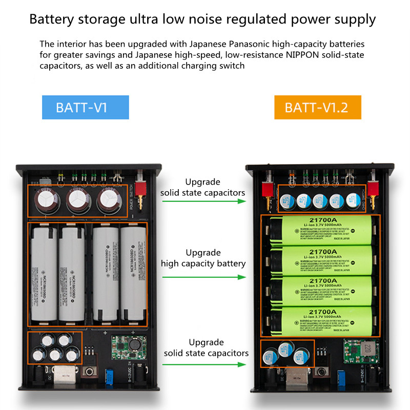 - Using pure battery power supply to significantly reduce interference, a set of advanced audio systems, and an important part of the system is the power supply. The best power supply is the battery, which converts AC power into DC power and provides pure power supply, and it is the best solution. Battery powered provides sufficient clean power for each device, solving the problem of traditional AC power sources being greatly affected by the environment, making the sound more stable and quiet. The battery uses for Panasonic 21700 lithium battery, with a huge capacity of 20000mAh and a much higher volume energy density than other ordinary lithium batteries. The battery has good stability and performance.