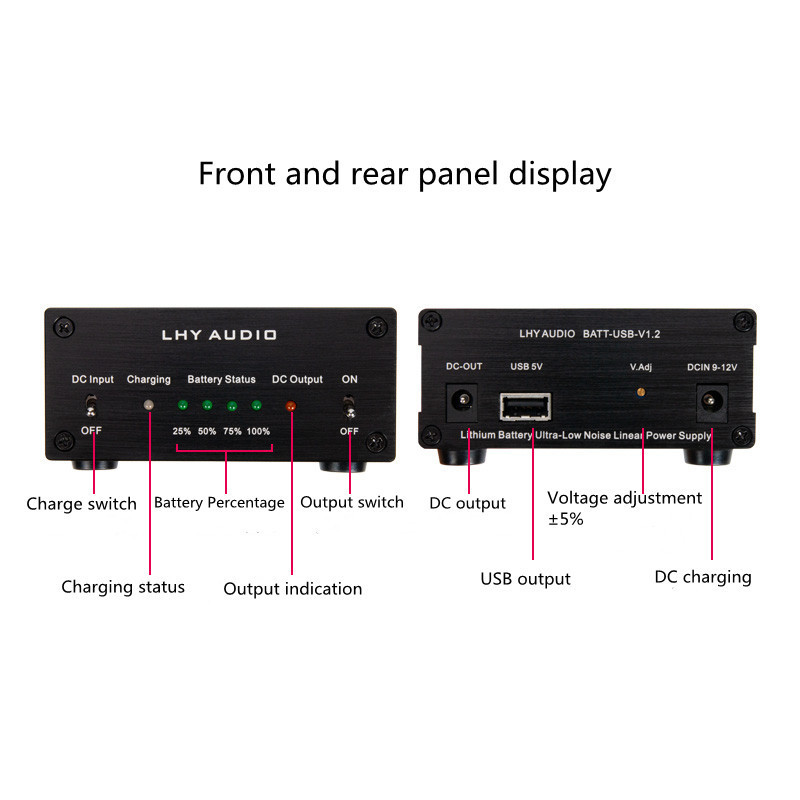 - Output terminal: USB + DC 5.5mm/2.1mm (positive inside and negative outside)