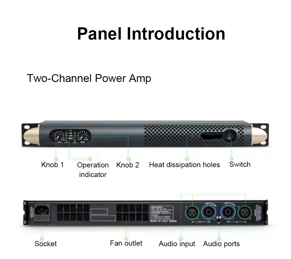 - Power output and intelligent control: The amplifier can control the power output. The power scale setting of the panel allows the connected speakers to operate within the power requirements, ensuring safe and reliable work