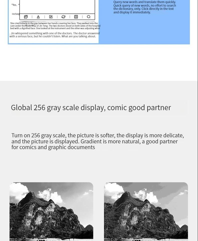 - Enabling 256 grayscale makes the image softer, the display more delicate, and the image gradient more natural. It is the best partner for comics and graphic documents.
