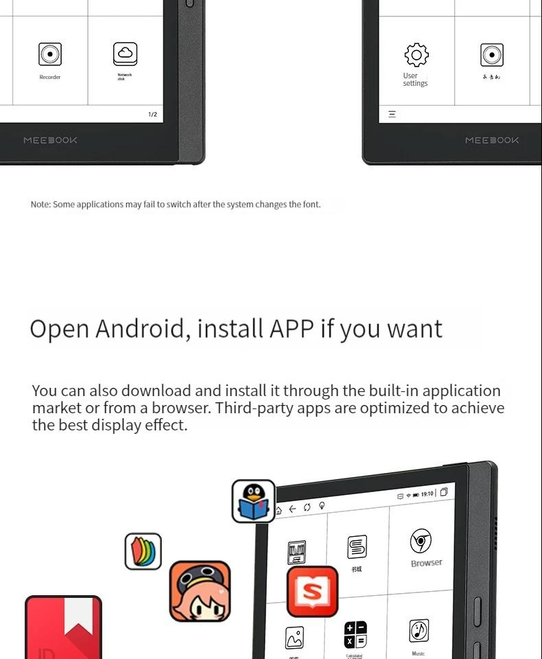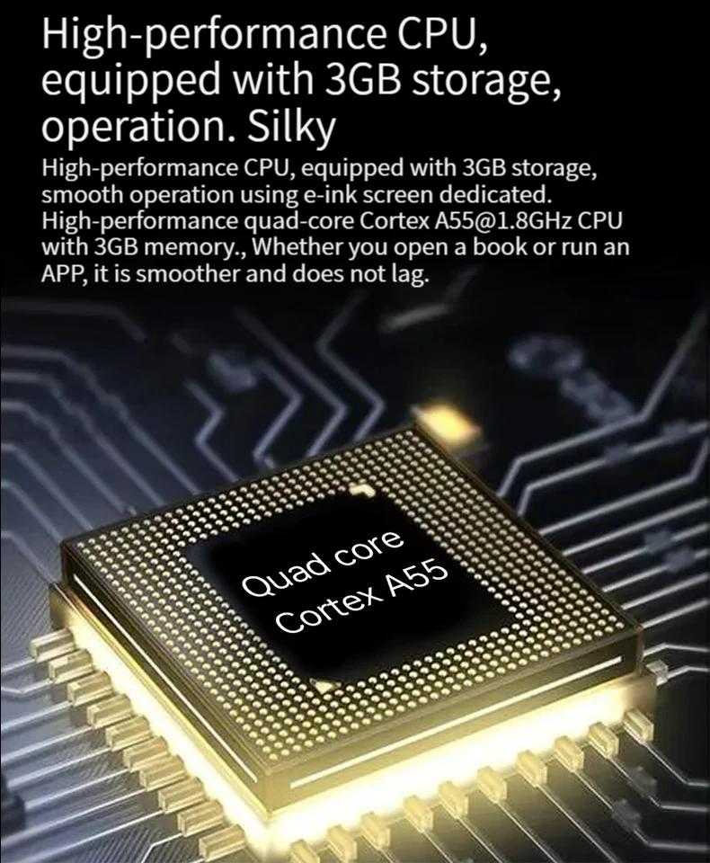 - Adopting high-performance quad core technology specifically designed for ink screens Cortex A55 at 1.8GHz CPU, which is equipped with industry-leading 3GB of memory, making it smoother and less laggy when opening books or running apps.