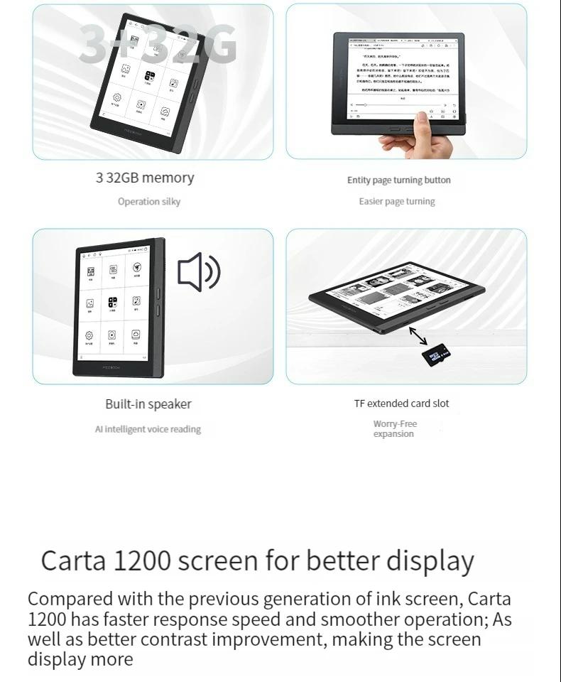 - Compared to the previous generation ink screen, for Carta1200 has a faster response speed (+20%) and smoother operation; And better contrast enhancement (+18%), 300PPI, making the screen display more outstanding and closer to the real paper effect.