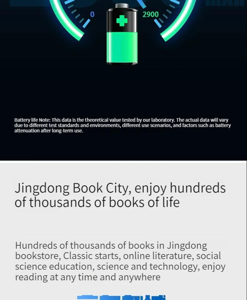 - Thanks to the low-power dedicated CPU, optimized control of the system, and a large 2900mAh battery, it can meet 45 days of standby battery life and several weeks of operating battery life (2 hours per day, without turning on the front light and WIFI) when fully charged.
