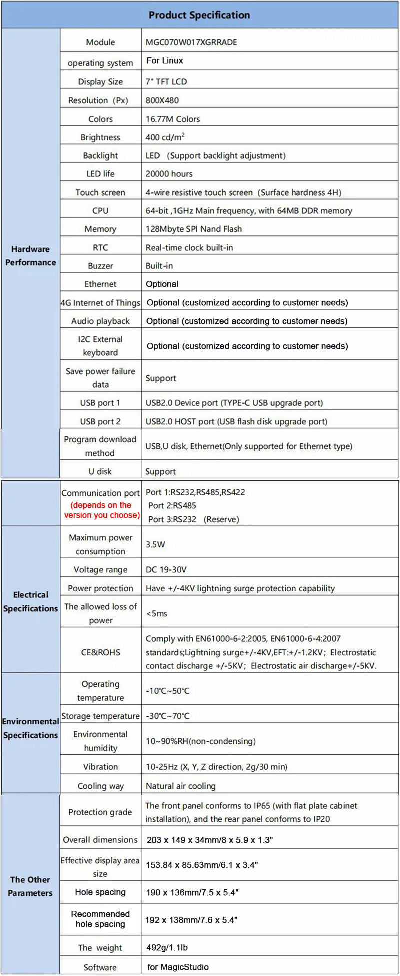 MGC 7 Inch HMI Display Resistive Touch Screen (Dual Serial + Ethernet Port) for IoT Industrial PLC