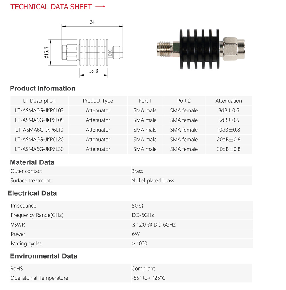 Microwave RF Attenuator 3dB High Quality Coaxial Fixed 6W Attenuator 50ohm SMA-JK-6G DC-6GHz Radio Accessory