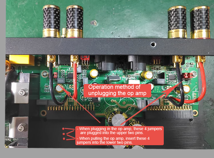 Currently, the buffer board is with a gain of 14dB. Unplugging the op amp, it is equivalent to a straight-through power amplifier. Without the buffer board, that is, the gain will be smaller than 14dB (for the amplifier with a volume knob, the volume will also have no effect). While unplugging the op amp, there are 4 short-circuit pins inside, and it is necessary to jump to the other two pins of the three pin headers. When plugging in the op amp, it is necessary to jump back, otherwise it will affect the distortion of the whole machine.