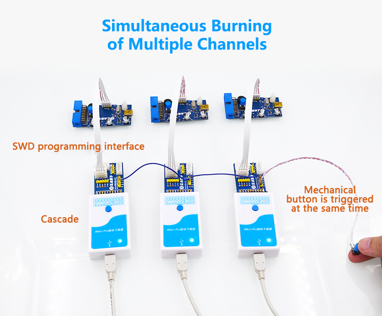Now Mini-Pro downloads programs at once, and then downloads it to multiple products, featuring fast speed and high efficiency. No computer is required. It is your ideal assistant in mass production.