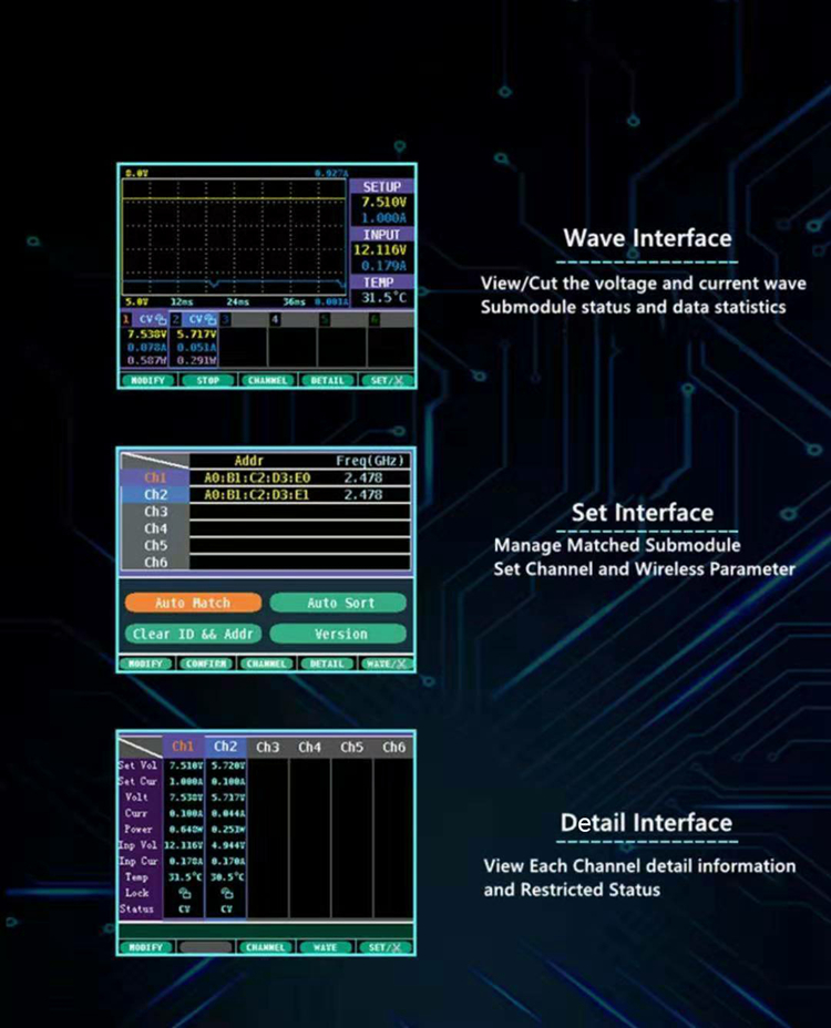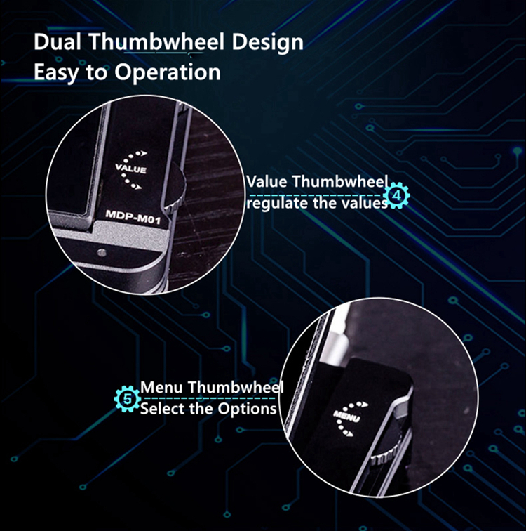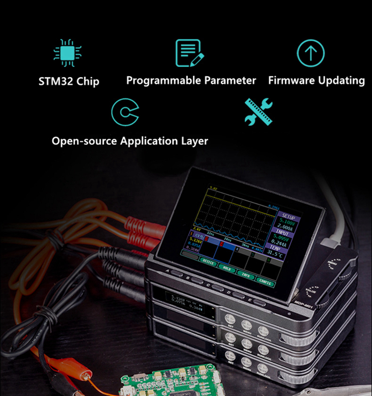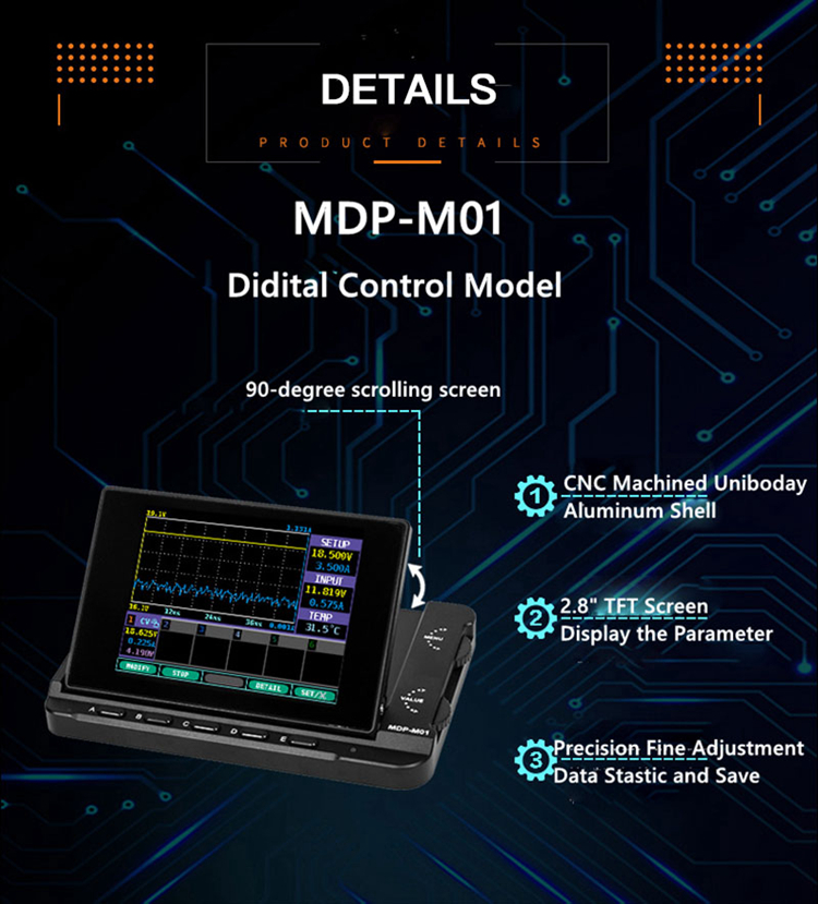 MDP-M01 Smart Digital Monitor: 2.8-inch TFT screen can display voltage / current waveforms in real time. Support data statistics. Automatic pairing control of 6 sub-modules, double-dial wheel control, 90-degree flip human-friendly design.