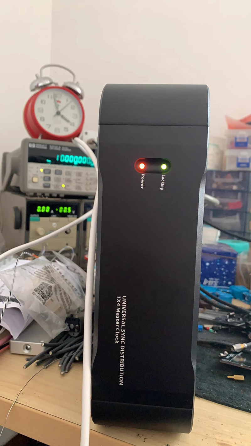 MV89 is a master clock. It can be used as an OCXO clock generator. There are locking and power indicator lights and four 10MHz output ports. It is powered by AC power supply.