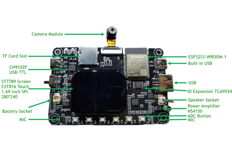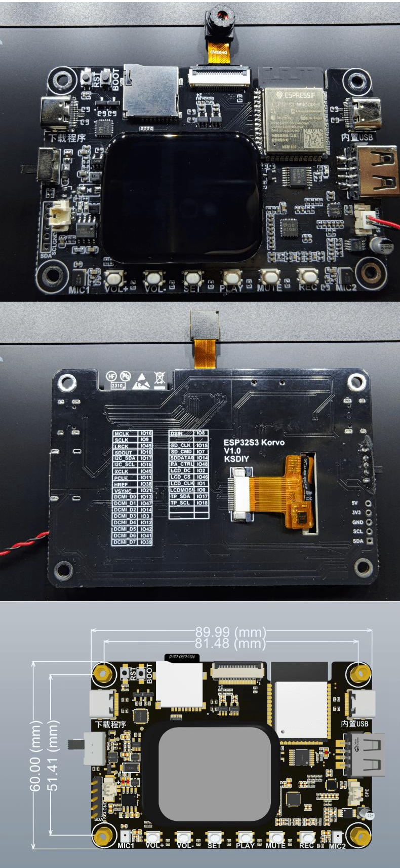 - Dual USB output, one CH9102F, one ESP32S3 built-in USB 7, onboard DVP camera FPC socket, can be used with OV2640 GC0308 7725 5640.