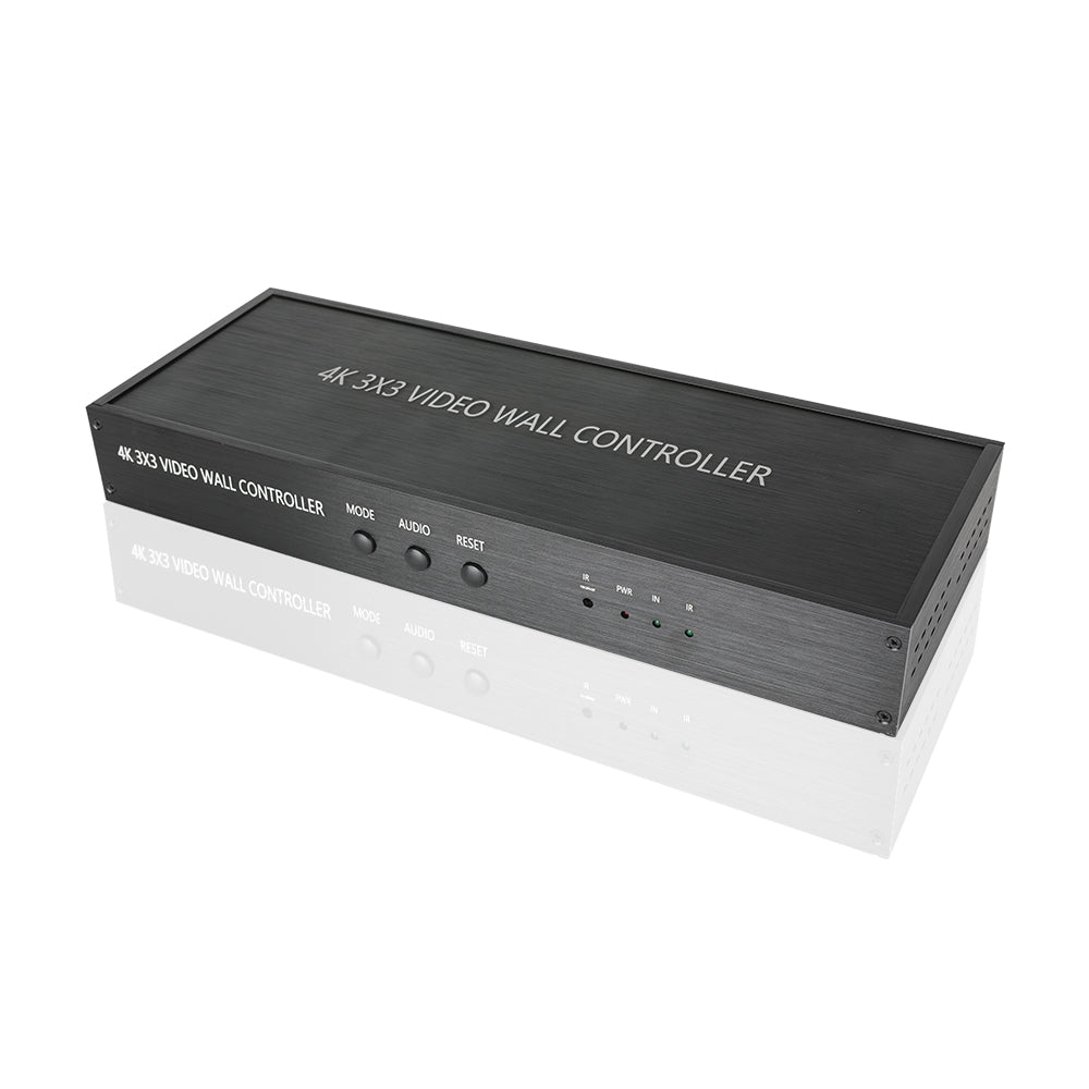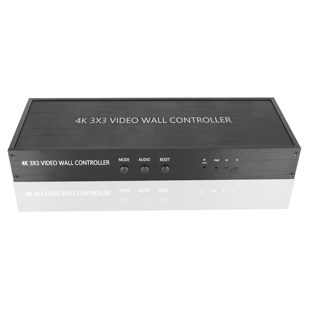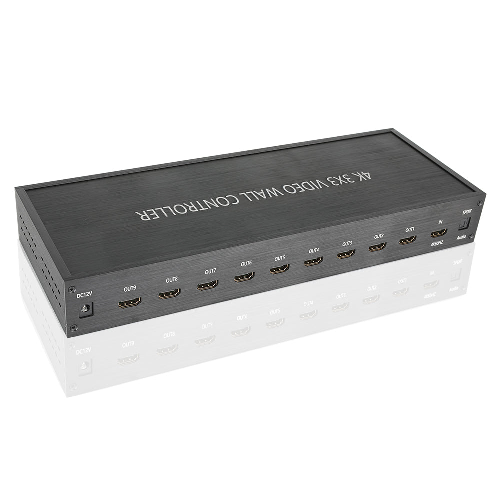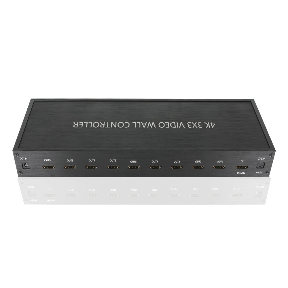 The 3x3 video wall controller supports 1-way HDMI input and 9 HDMI output. Its main function is to divide a complete HDMI, HD image signal into 9 blocks and assign to 9 video display unit (such as Rear projection unit, LCD TV, etc.). Complete with 9 HDMI high-definition video display units to form a large dynamic image screen.