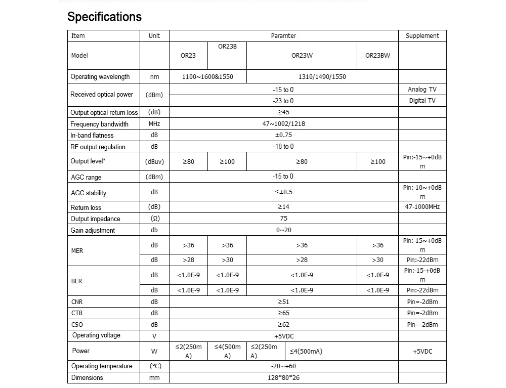 OR23B is a low-temperature, high-reliability, high-index multi-purpose optical receiver. The optical receiver is suitable for CATV fiber optic transmission, buildings, and indoor uses. It has the function of optical control AGC. It can keep the output impedance 75Ω unchanged in the range of -15 to -7dbm in the optical input power. RF1/2 of the output ports is a distributed output (the output of both ports is the same).