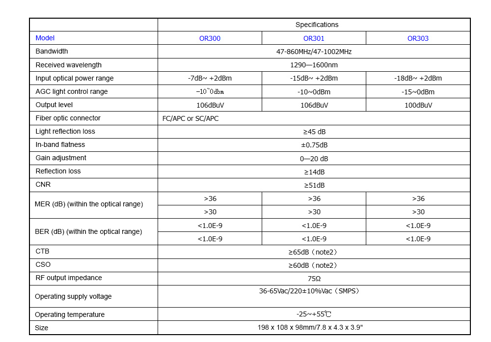 The product adopts the shell of ice flower sandblasting process, and the waterproof level is increased to IP67! The OR303 module is suitable for digital TV, with a minimum received optical power of -18dbm. Average output level is 100dbuv!