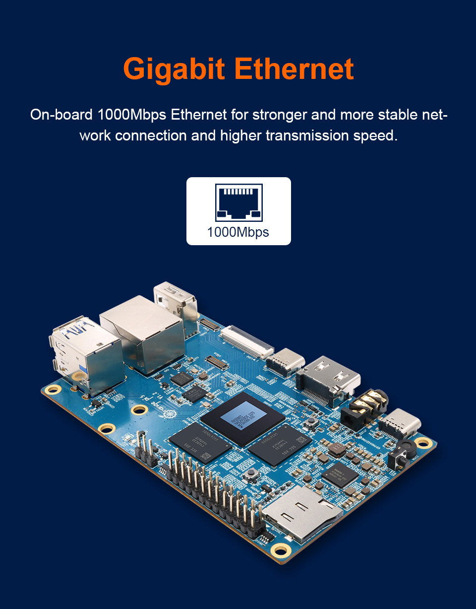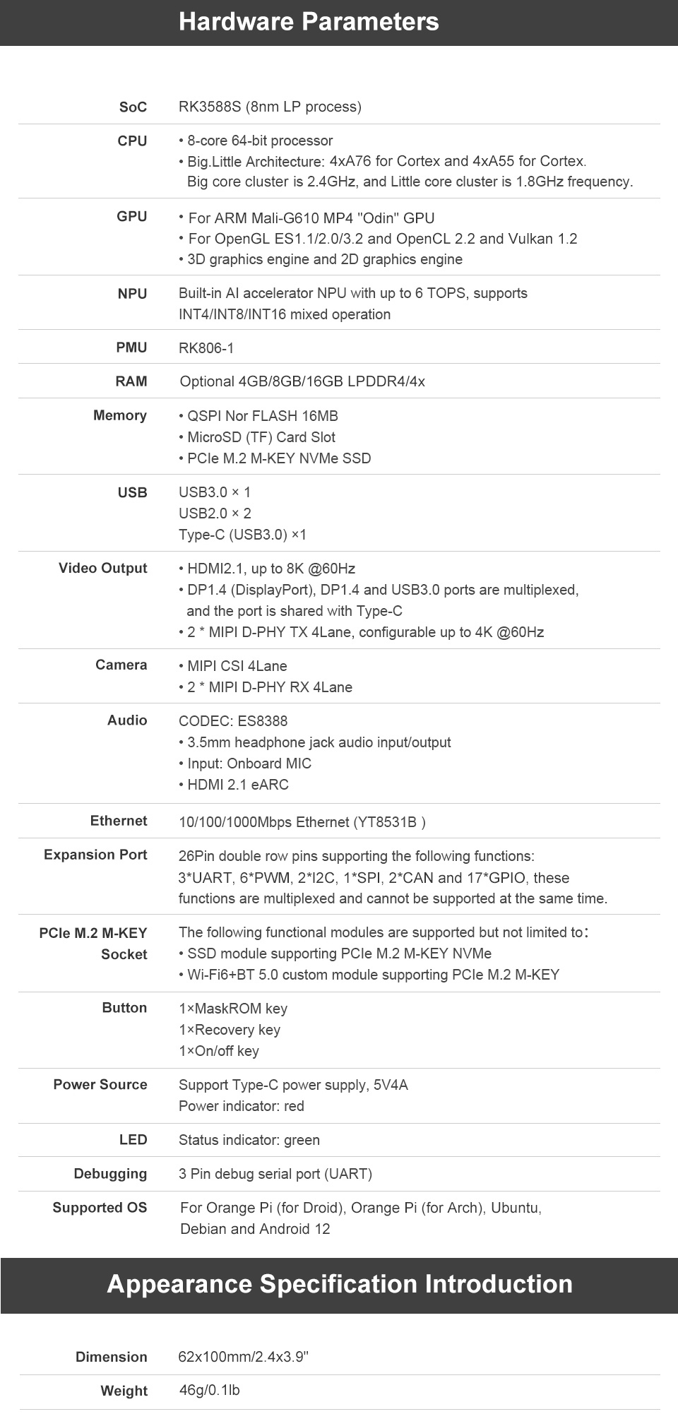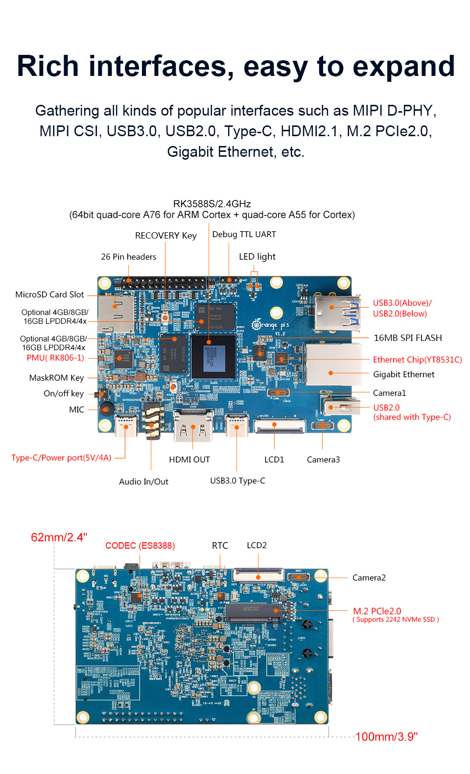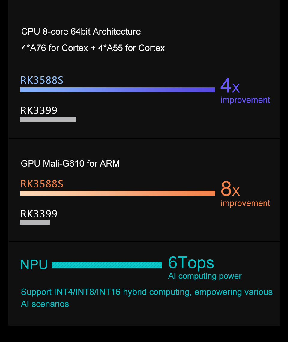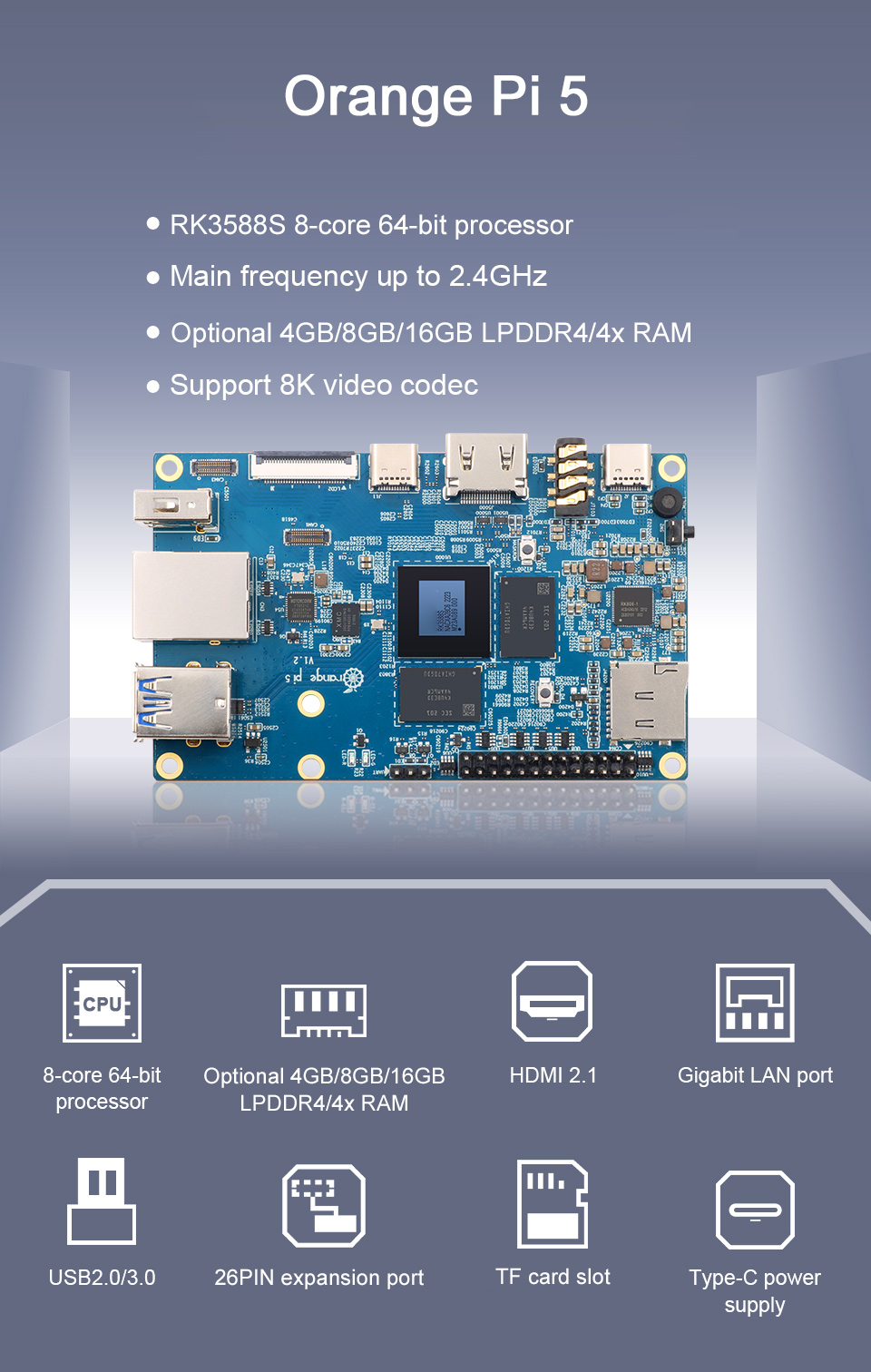 Orange Pi 5 uses RK3588S new generation 8-core 64-bit processor, quad-core A76 + quad-core A55, with 8nm process design, up to 2.4GHz main frequency and integrated Mali-G610 GPU for ARM. It is designed with an embedded high-performance 3D/2D image acceleration module, built-in NPU with 6Tops computing power, with optional 4GB/8GB/16GB/32GB (LPDDR4/4x) RAM, and up to 8K display processing capability.