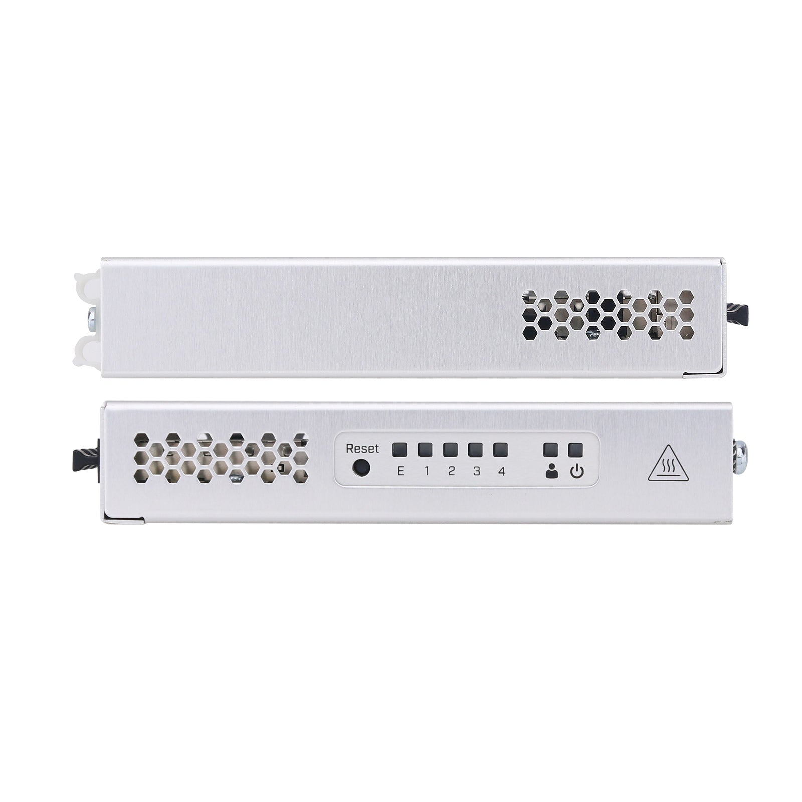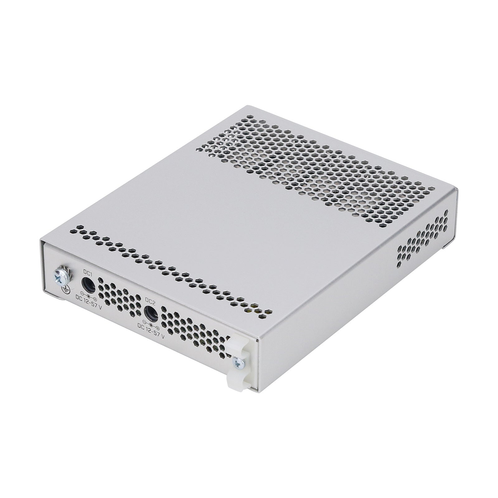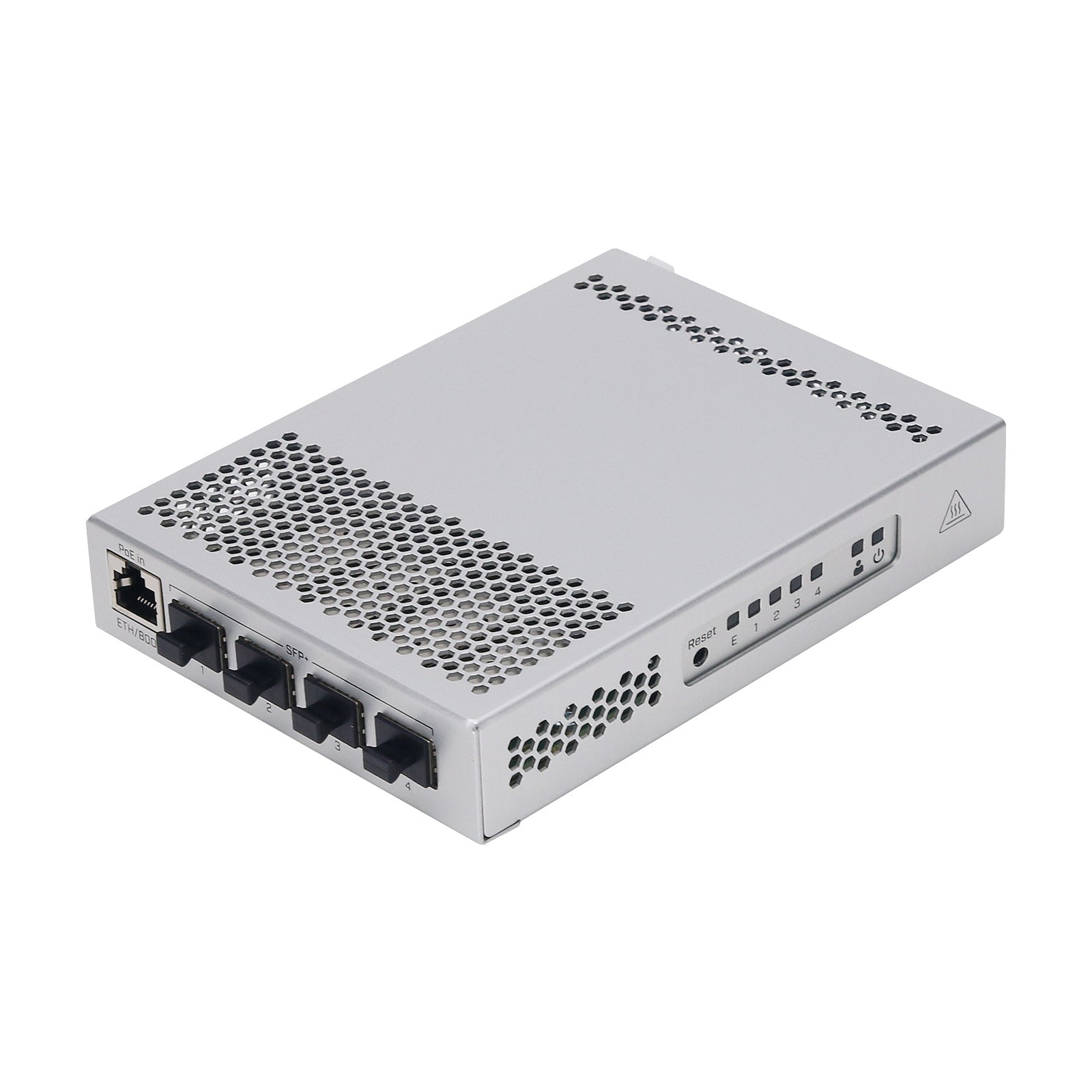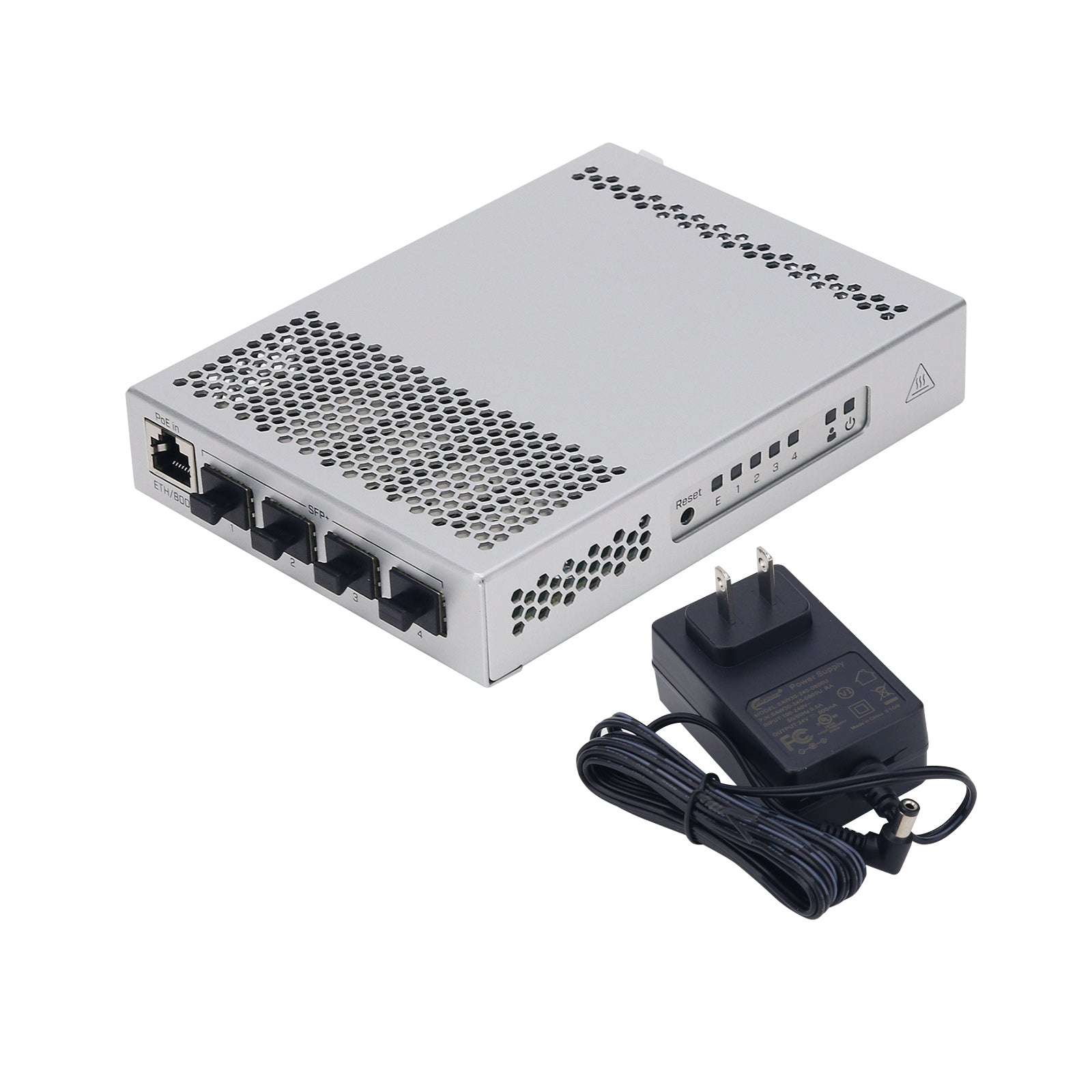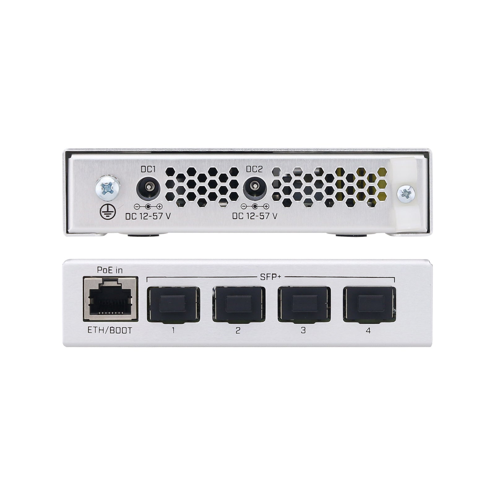 - It is a compact yet very powerful switch, featuring four SFP+ ports, for up to 10 Gbit per port. The device has a 1 Gbit copper ethernet port for management access or regular traffic forwarding and two DC jacks for power redundancy. The device is a very sleek and compact metallic case without any fans, for silent operation.