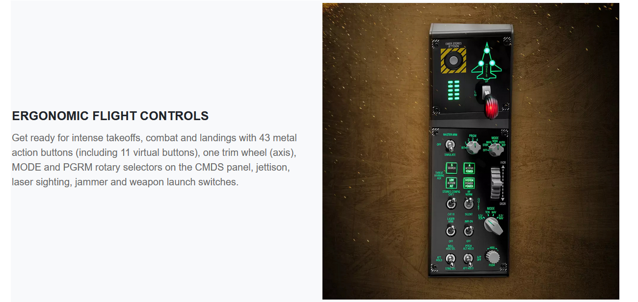 Viper Panel is made for intense takeoffs, combat and landings with 43 metal action buttons (including 11 virtual buttons), one trim wheel (axis), MODE and PGRM rotary selectors on the CMDS panel, plus laser sighting, jammer and weapon launch switches. Unleash the potential of Viper Panel by expanding its flight and combat capabilities with Viper TQS (Throttle Quadrant System), sold separately.