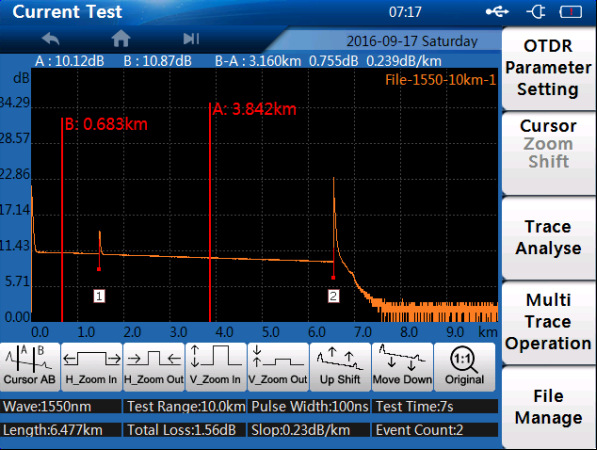 - Automatic Measurement Mode: Operators do not need to choose the test distance and pulse width, the tester will automatically judge the length, and choose suitable dynamic range as well as pulse width to complete the work; The storage of event trace can be saves manually or automatically which will be convenient for data analysis