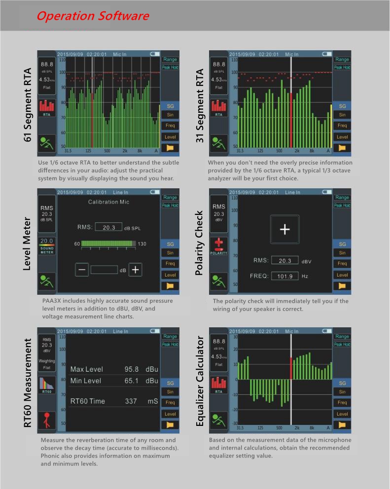 - RTA: 1/3 octave and 1/6 octave with a resolution of 0.5dB, center from 20Hz frequency ISO standard to 20KHz