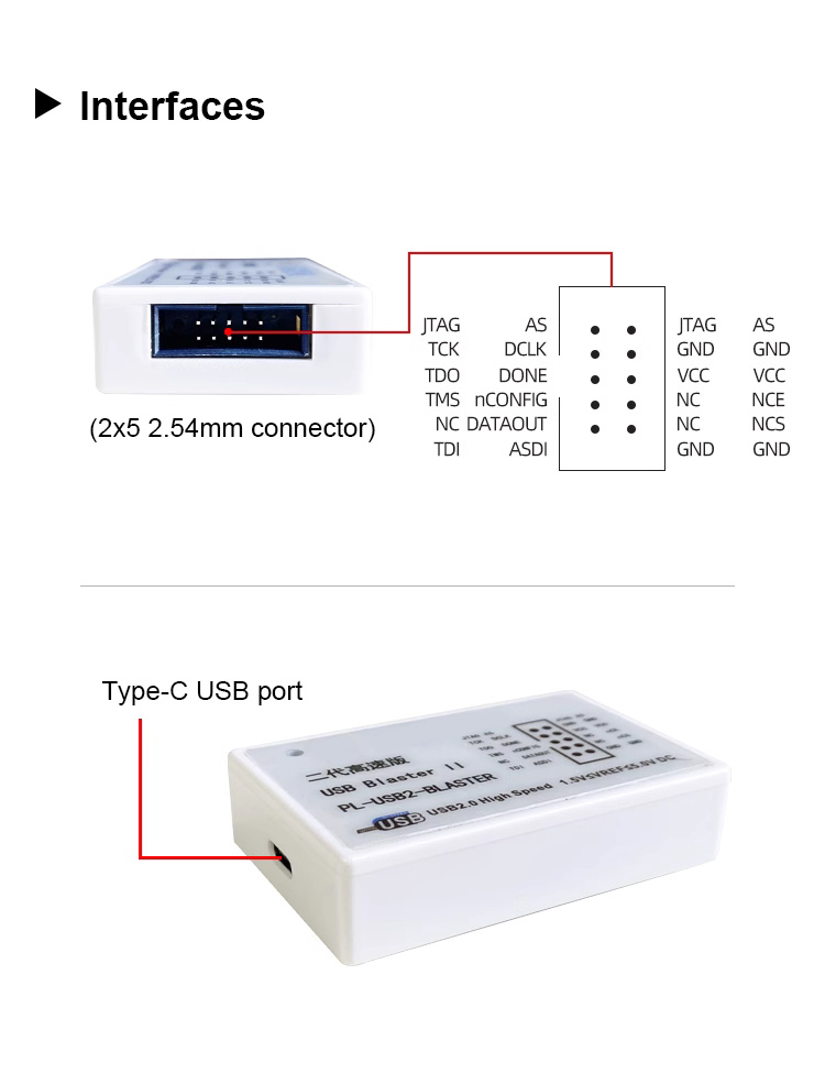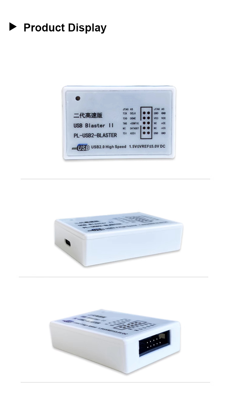 - Functional Compatibility: It supports SoF program download, JIC burning, burning POF in AS mode, Signaltap II online debugging, In-System-Sources-and-Probes online debugging, In-Sytem-memory-Content-Editor online debugging, NIOS II program download, NIOS II program online debugging, JTAG-UART serial port function, etc.
