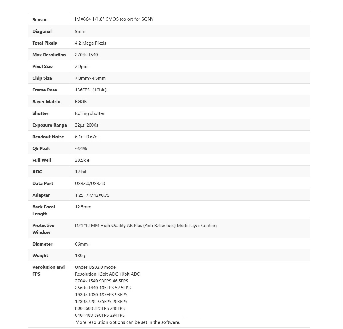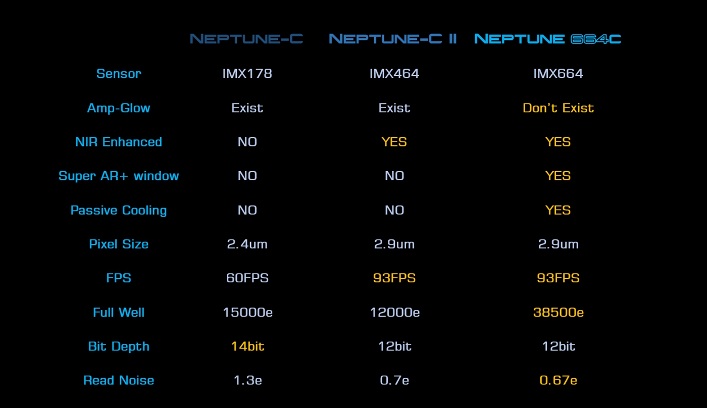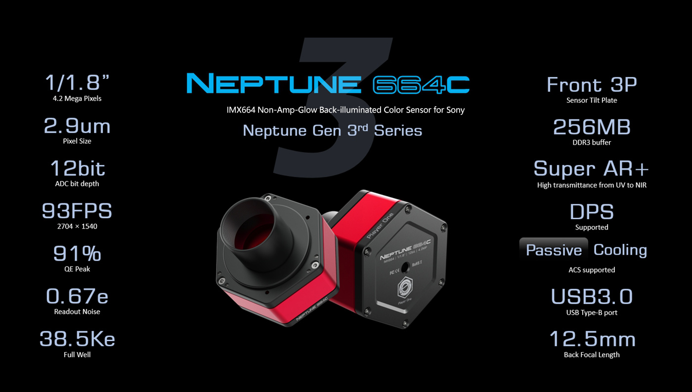 NEPTUNE 664C opened NEPTUNE 3rd Gen gate. It is the newest planetary camera developed by Player One Astronomy. A successor of Neptune-C II (IMX464) camera. NEPTUNE 664C camera adopts the IMX664 1/1.8" color sensor for Sony. The 2.9um pixel size accommodates a well depth of 38.5ke with a total of 4.2MP (the resolution is 2704*1540), and the diagonal is 6.46 mm.
