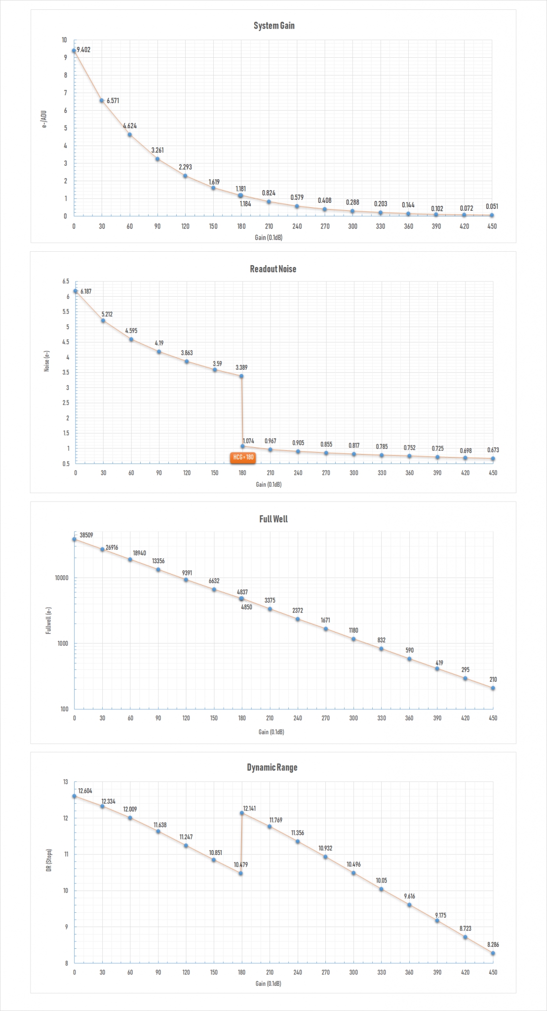 NEPTUNE 664C camera has a unique HCG mode, which will automatically turn on when the camera gain setting is ≥180. The HCG mode can greatly reduce the readout noise and retain the same high dynamic range as the low gain.