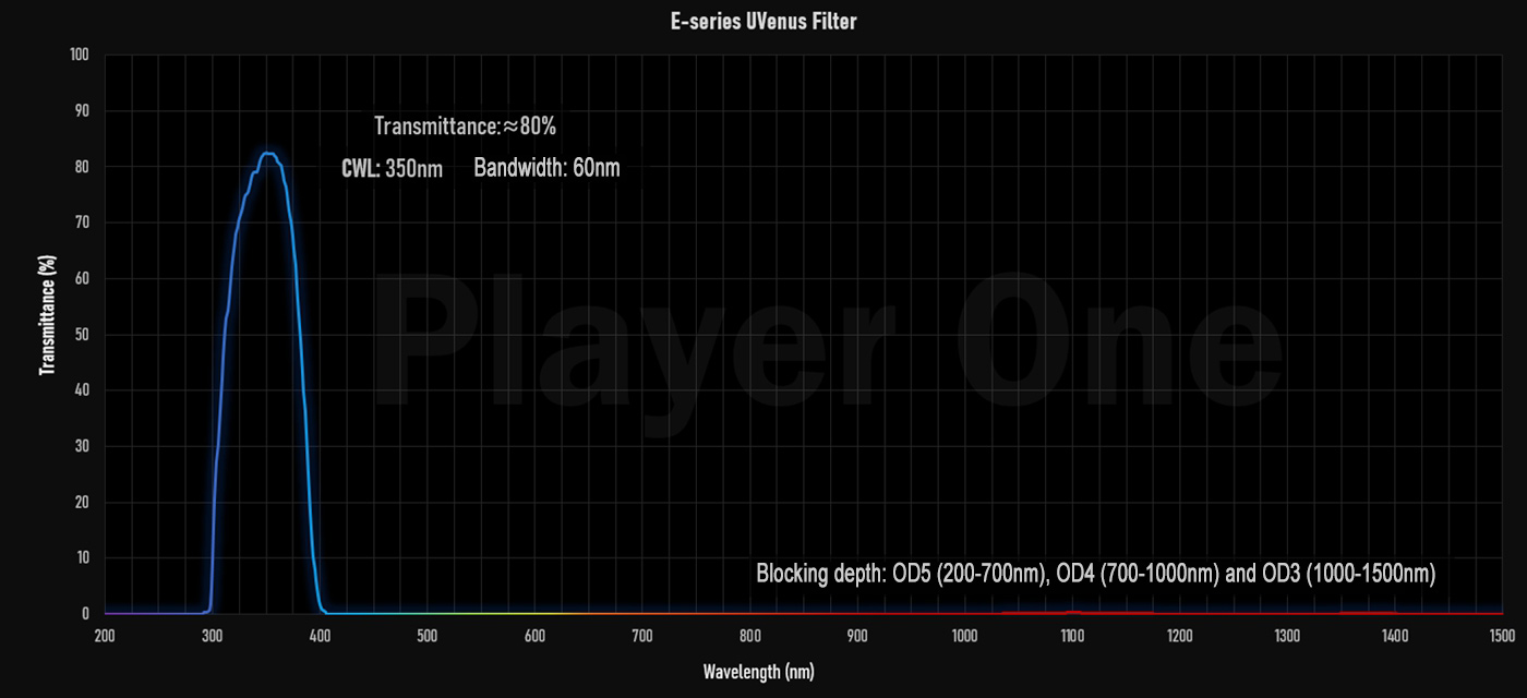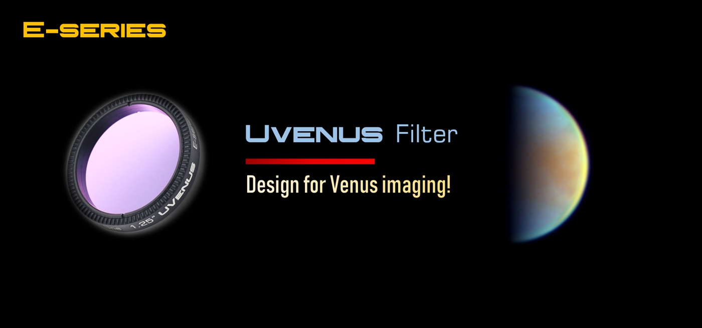 UVenus 1.25" UV-PASS Filter is designed for Venus imaging. It is an ultraviolet filter, only allowing 320nm-380nm ultraviolet light to pass. It can be used to take pictures of the clouds of Venus.