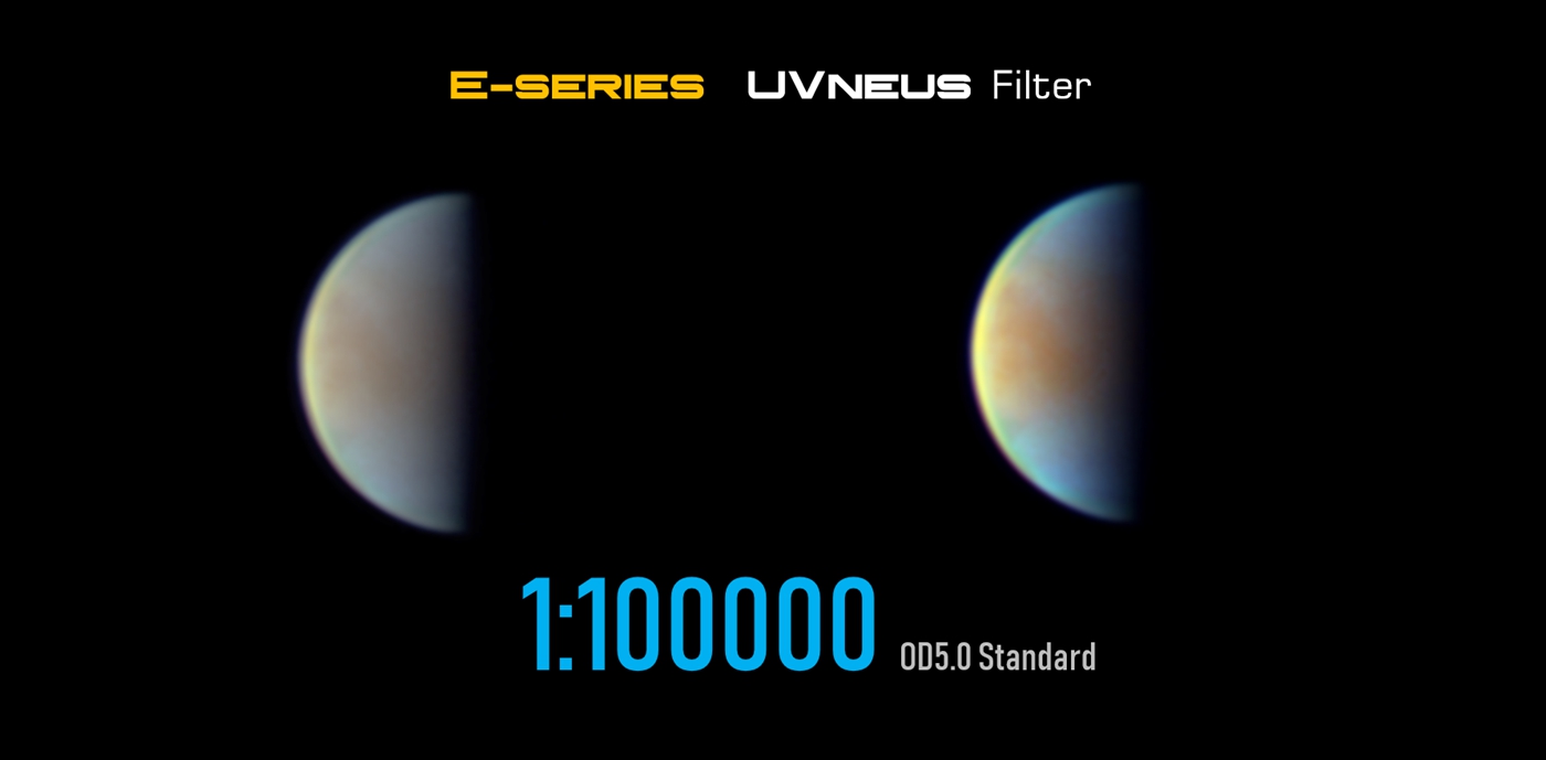 As we know, Venus has a very thick atmosphere, and the clouds have very high reflection of ultraviolet. Using a UVenus filter can enhance the details of Venus. Our UVenus filter has 80% peak transmittance and OD5.0 off-band blocking. Thus, it can dramatically improve the imaging effect!
