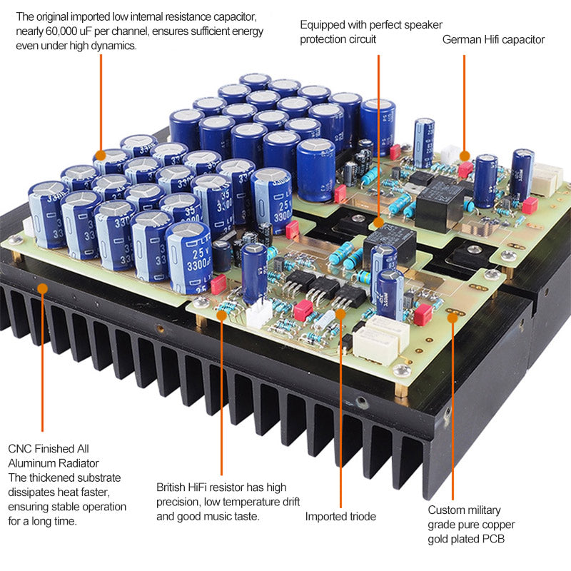 - Imported low internal resistance capacitors. Nearly 60,000 uF per channel. Ensure that sufficient energy can be provided even under high dynamics.