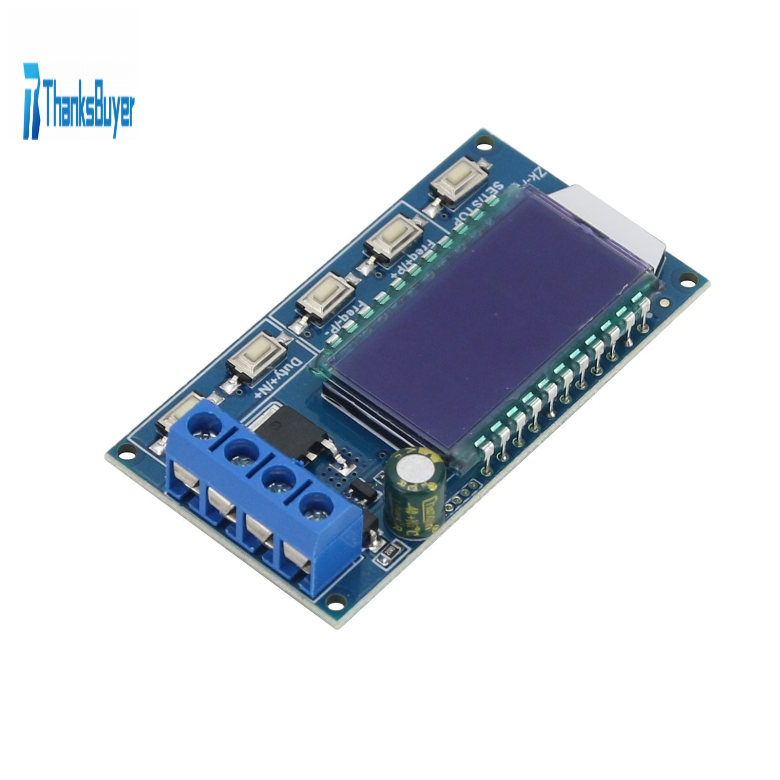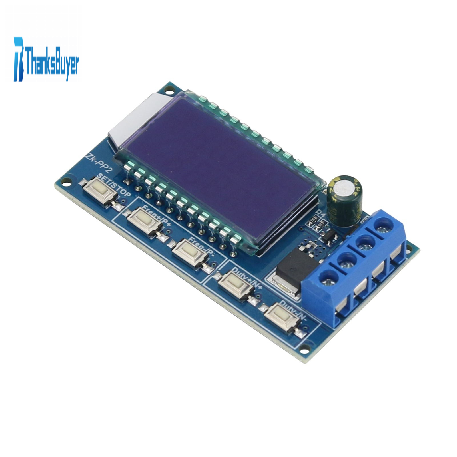 By buttons P + and P-, you can set positive pulse width time which is displayed on the top line in LCD screen. Press N + and N- buttons to set negative pulse width time, which will be displayed on the lower line in LCD screen, with unit in seconds. Short press button STOP to control signal to output or stop. Output is 0 when stopped. The module has output when the screen displays OUT. Otherwise, output is stopped. Default positive pulse width is 0.5 seconds, and negative pulse width is 0.5 seconds.