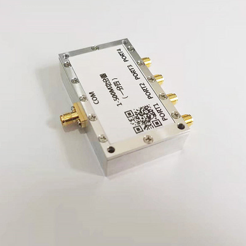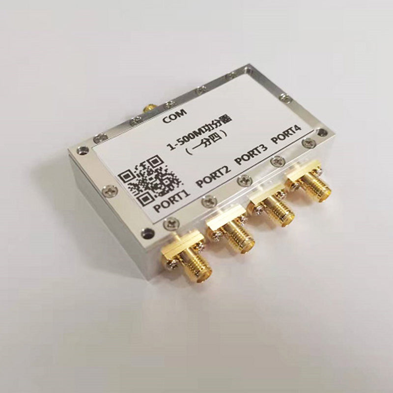 A power divider is a device that divides the energy of one input signal into two or multiple channels to output equal or unequal energy, and can also combine the energy of multiple signals into one output in turn, which can also be called a combiner. This module realizes power quartering, used in the frequency range of 1-500M, and its low-end frequency can reach 500KHz. With low insertion loss and high isolation, it is widely used in typical transceiver systems below 500M. The module adopts CNC structure cavity, which has excellent electromagnetic shielding performance.