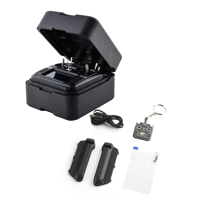 - Transmitter module: Option 1: Internal 4-in-1 multi-protocol module (CC2500, CYRF6936, A7105 and NRF2401); Option 2: Internal module ELRS (SX1280)