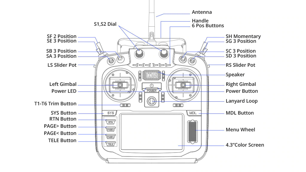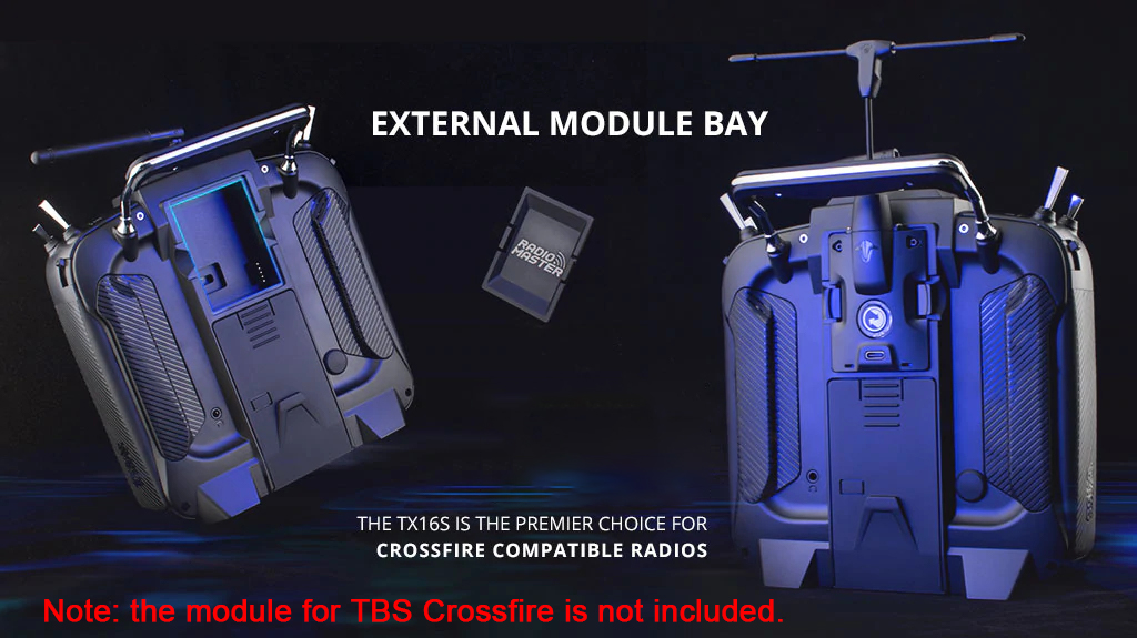 - Transmitter module: Option 1: Internal 4-in-1 multi-protocol module (CC2500, CYRF6936, A7105 and NRF2401); Option 2: Internal module ELRS (SX1280)