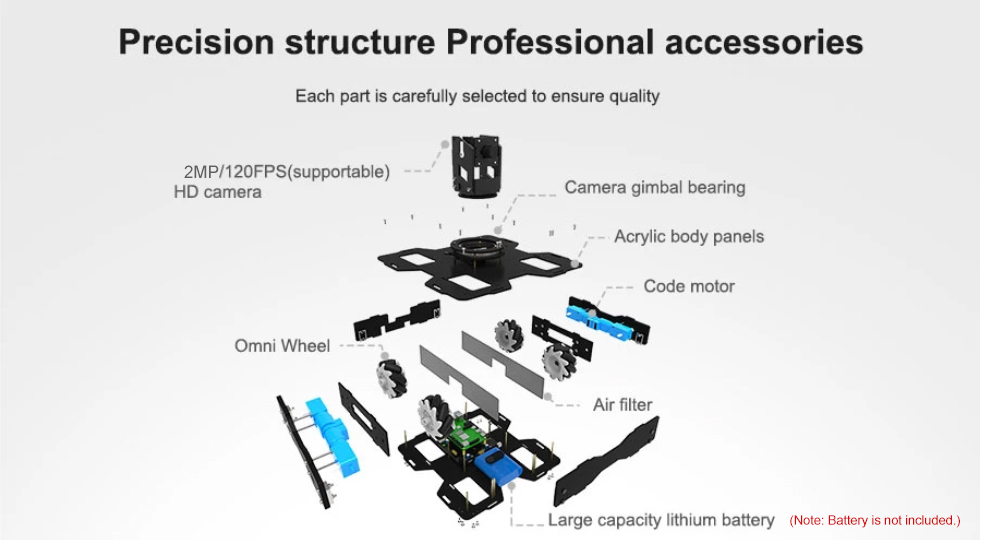 - Output: Four independent motor interfaces, buzzer, horn, 4 PWM servo interfaces