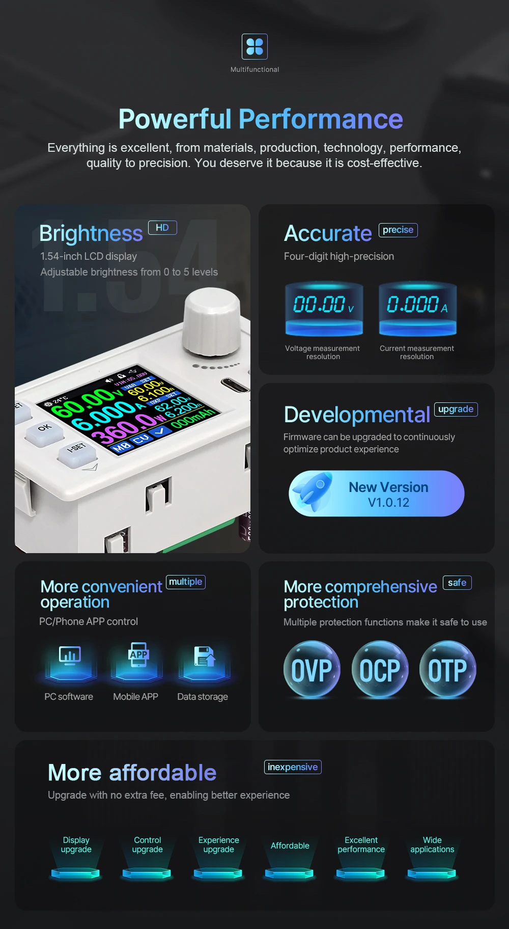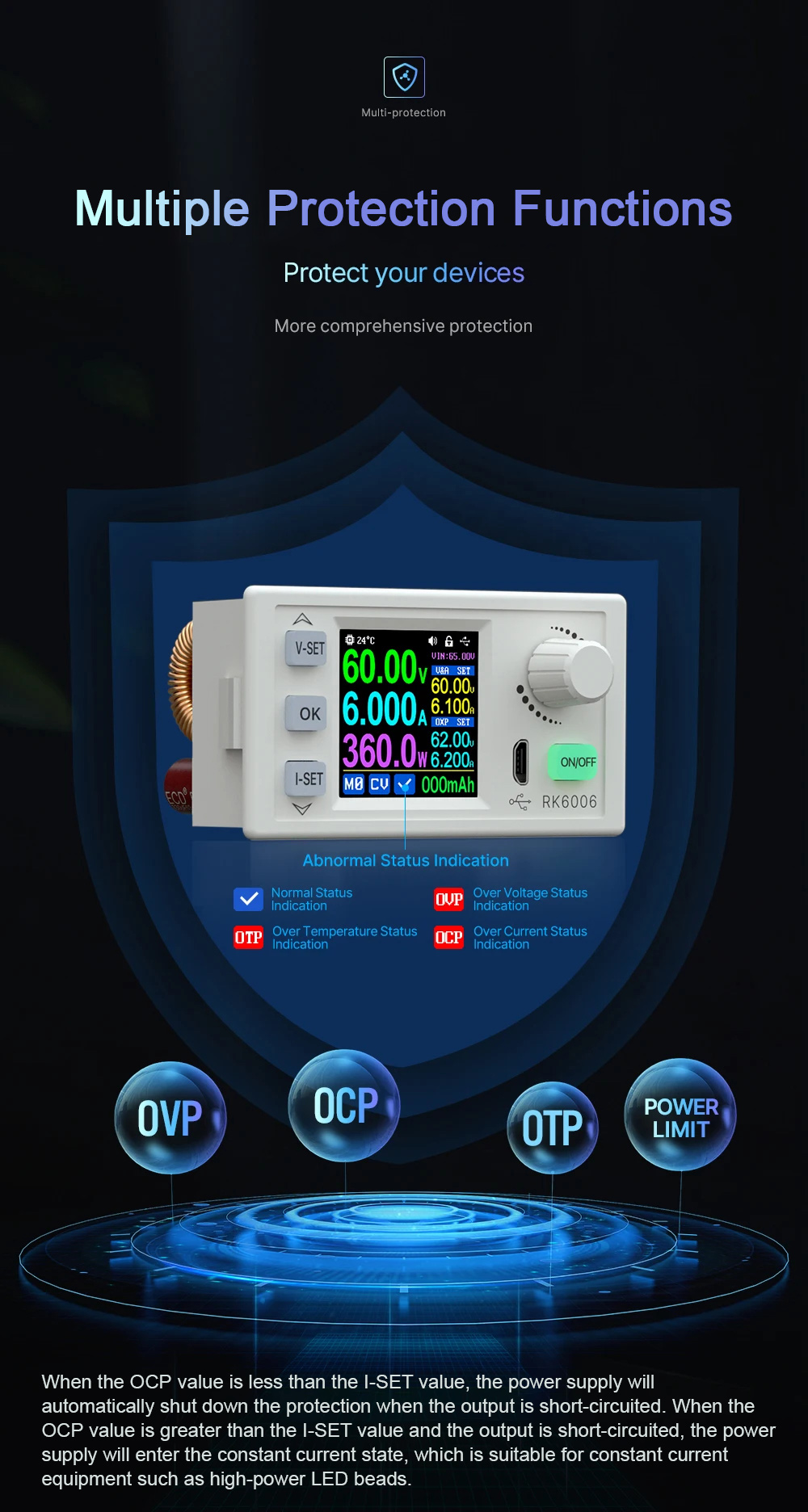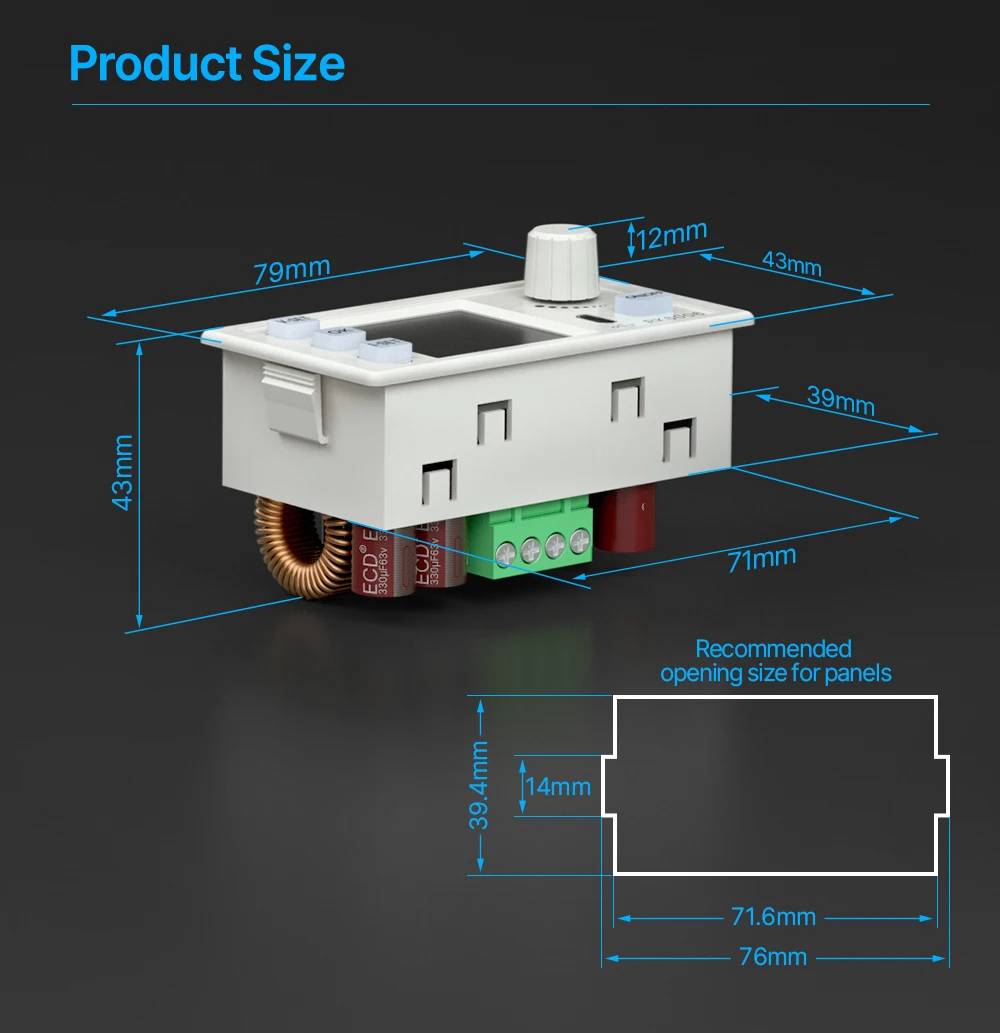 - Supports over-voltage protection, over-current protection and over-temperature protection to protect your loads and the device