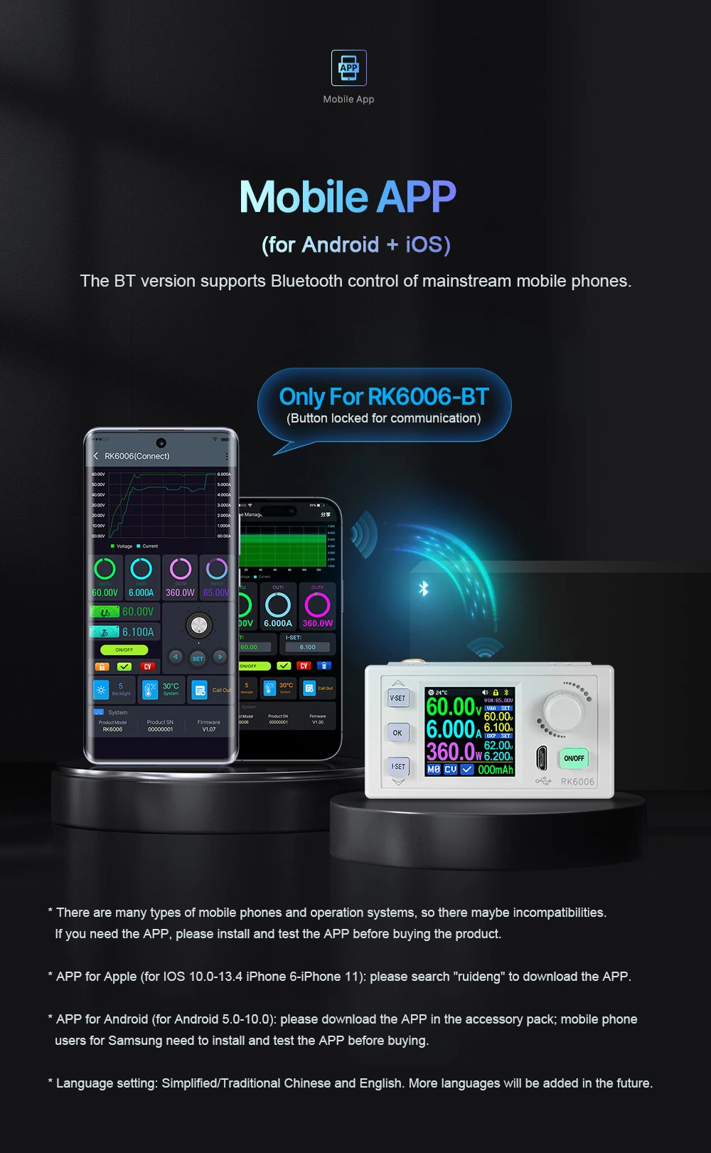 - APP control is also available! You can use the RUIDENG tech APP to connect the device, control and view the data (need to order the RK6006-BT version)