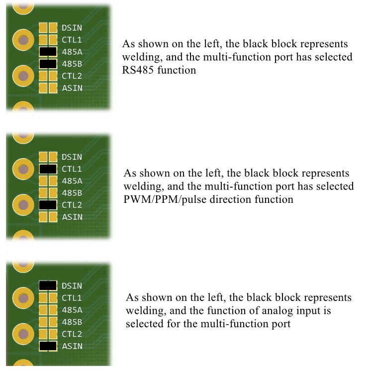 Due to the limitation of the number of interfaces, the driver's secondary communication port shares a 2pin external interface. On the back of the circuit board, 6 pads are left for users to choose which multiplexing function to enable.