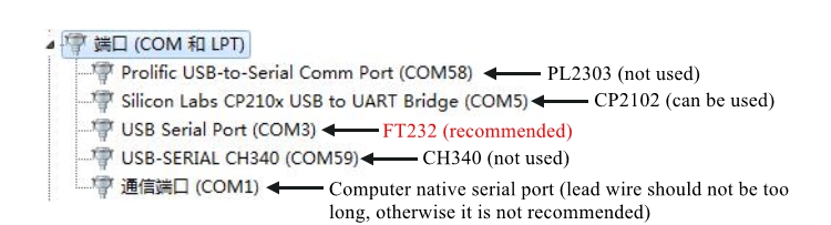 · If there is a serial cable, please insert the computer USB port in advance and check its type in the device manager. The different serial lines are displayed as follows in the device manager: