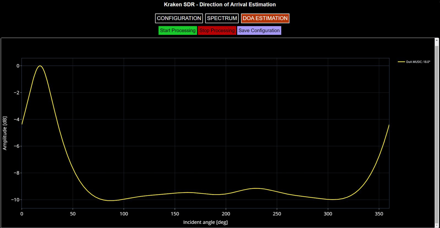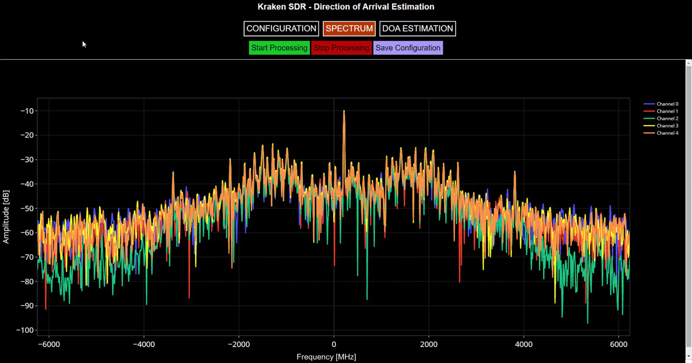 The new KrakenSDR software comes with an easy-to-use web interface for setting up a direction finding system. With this interface it is possible to set the frequency, gains, and other advanced settings related to the DAQ code. You can also monitor the live-spectrum view and graphs of output from the direction-finding algorithm.