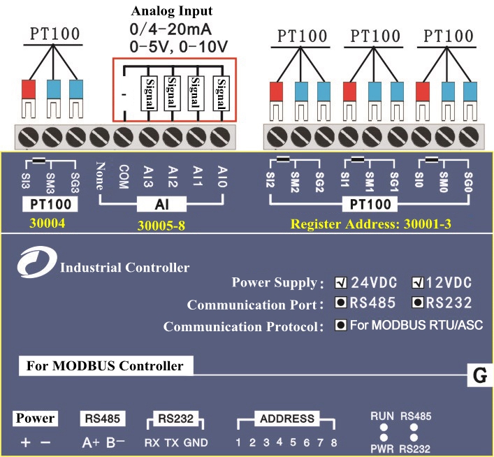 Support RS232, RS485 interface, for Modbus protocol touch screen, text screen.