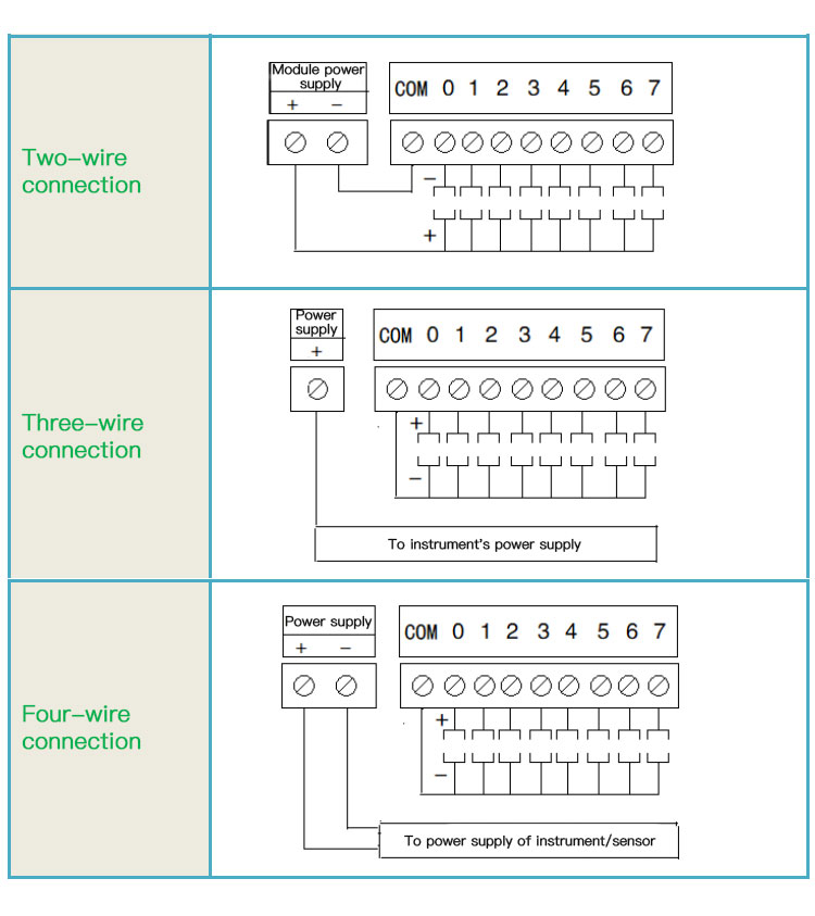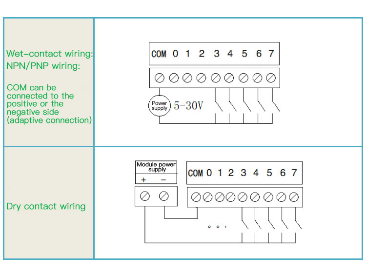 - Input methods: NPN, PNP, dry contact, and wet contact
