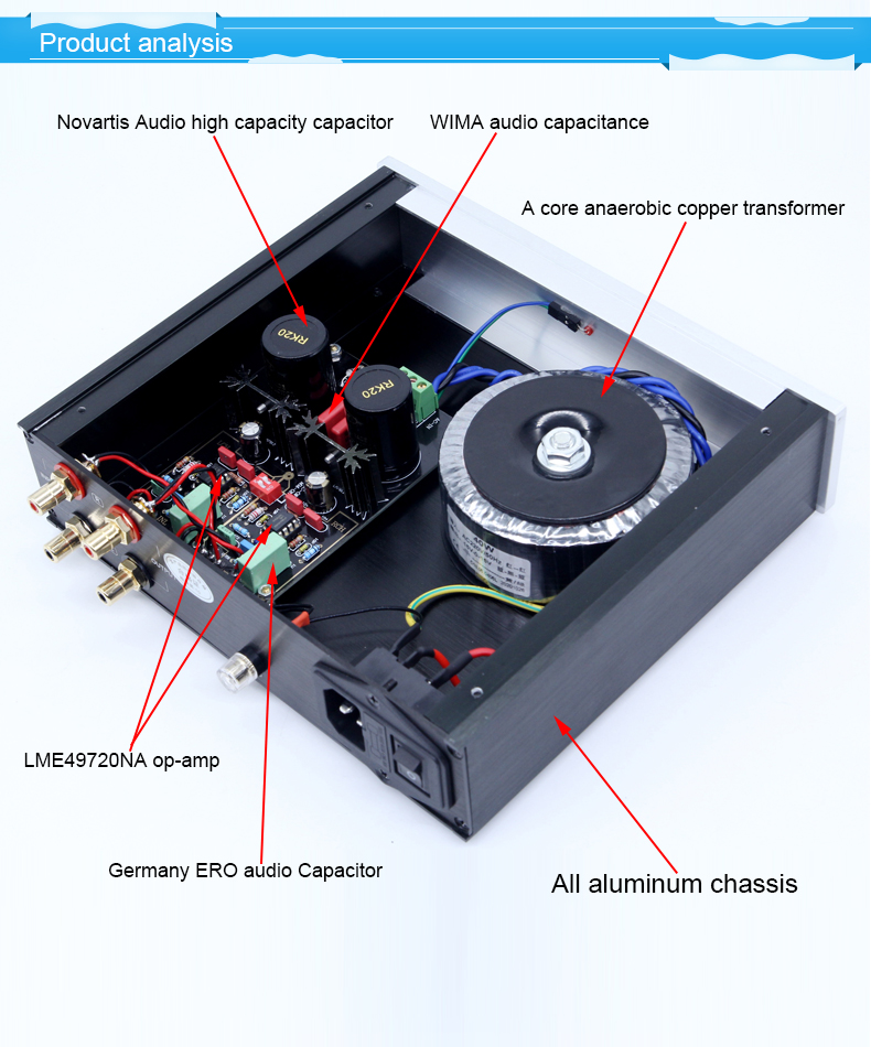 - The PCB adopts double-sided immersion gold technology, and the wiring is grounded at 1 point. The chassis is an all-aluminum alloy structure, and the input and output terminals are 24K gold-plated CMC816.