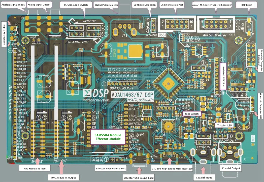- SAM5504 will do reverberation after inputting the direct sound. The EFFOUT terminal outputs the reverberation effect to the ADAU1463_SDATA_IN2 terminal, and the MUSIC terminal outputs USBaudio to the SDATA_IO3 terminal.
