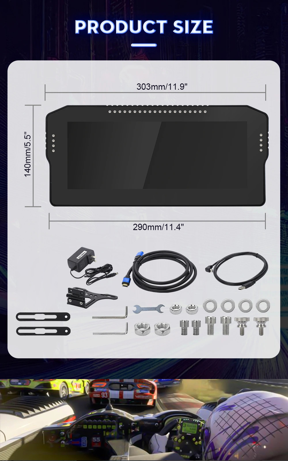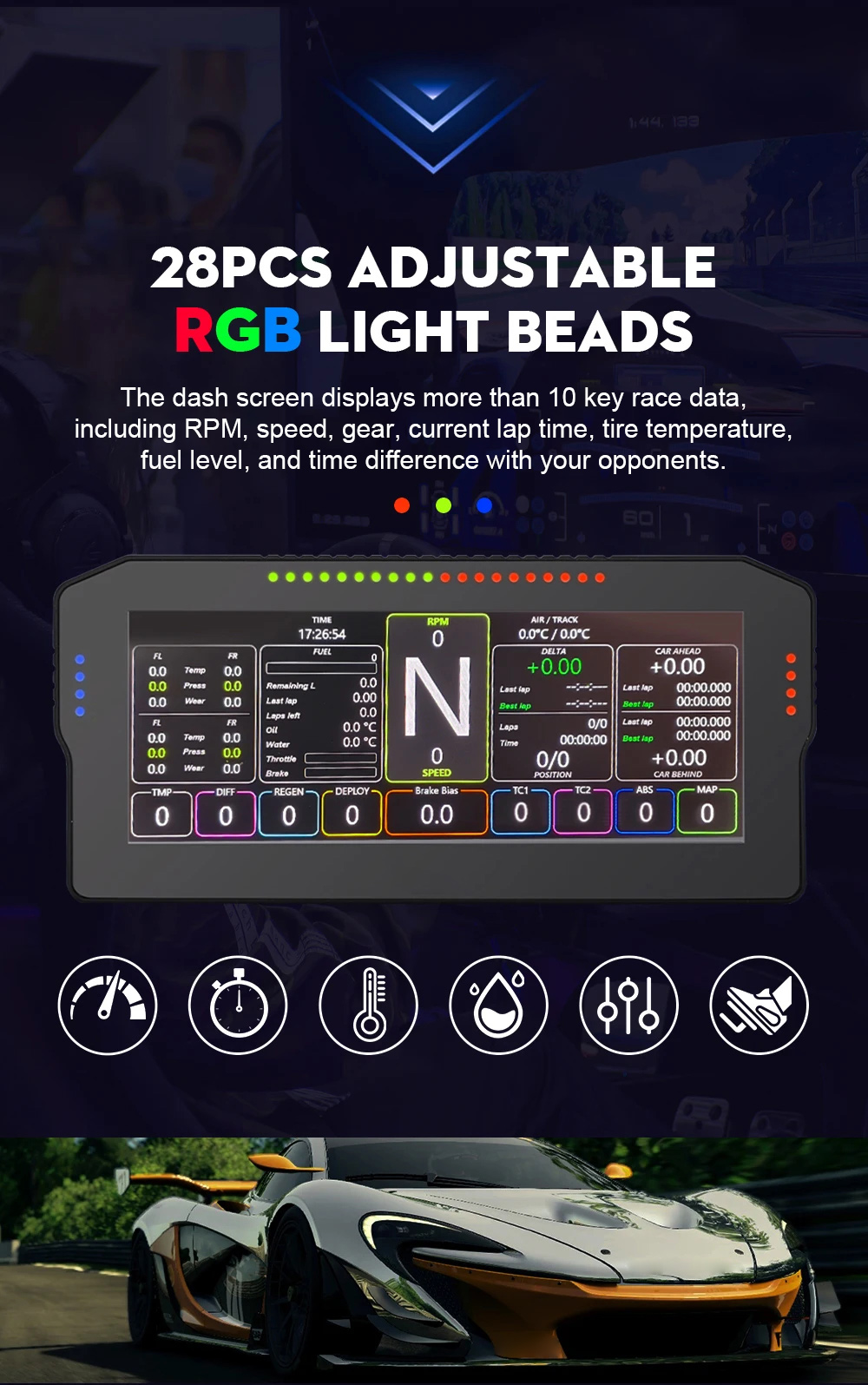 - The Simplayer dash screen can display more than 10 key race data, including RPM, speed, gear, current lap time, tire temperature, fuel level, and time difference with your opponents