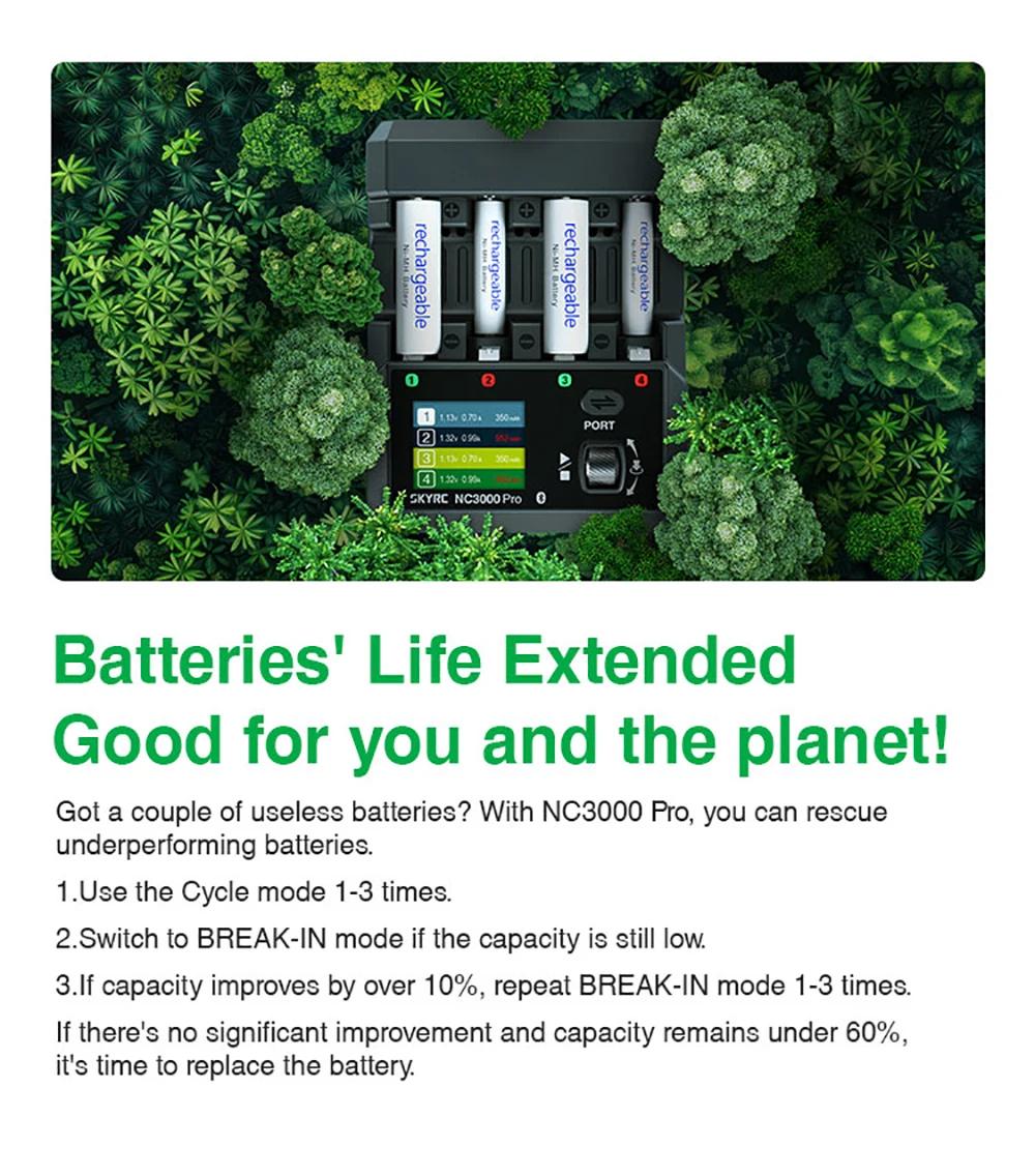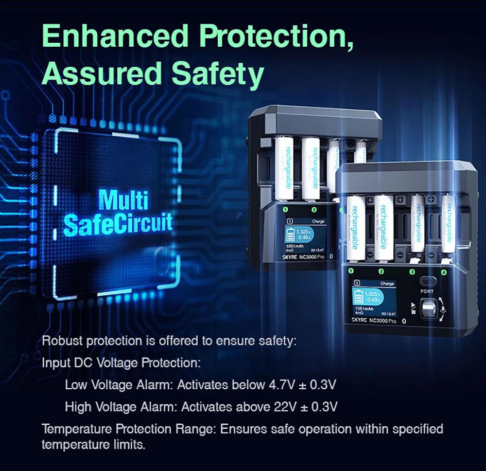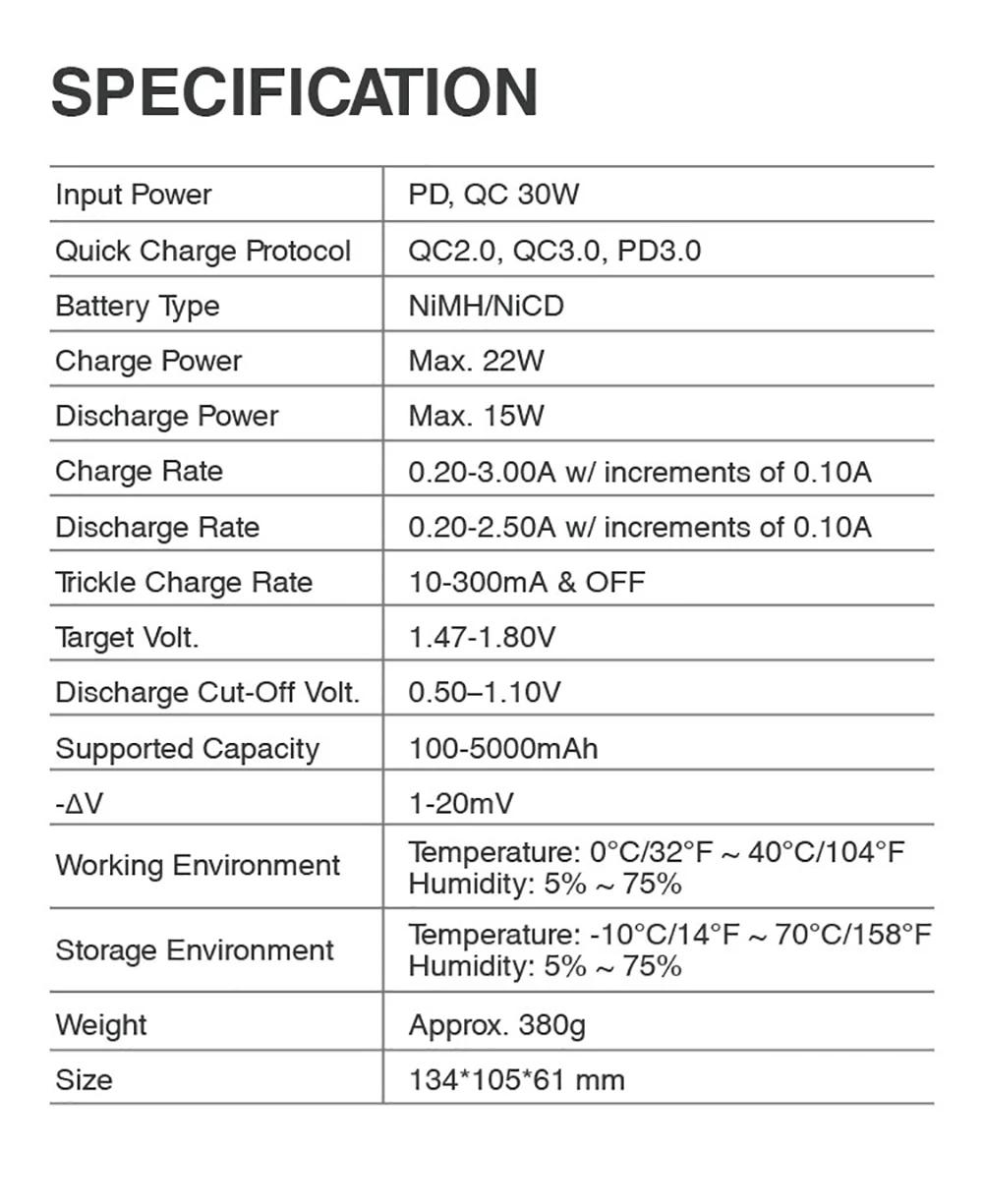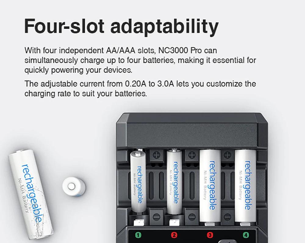 - With four independent AA/AAA slots, NC3000 Pro can simultaneously charge up to four batteries, adjustable current from 0.20A to 3.0A.